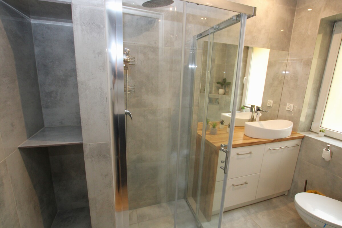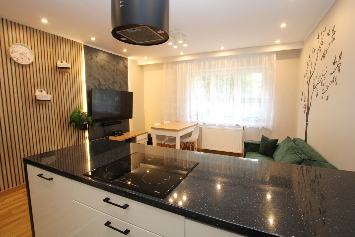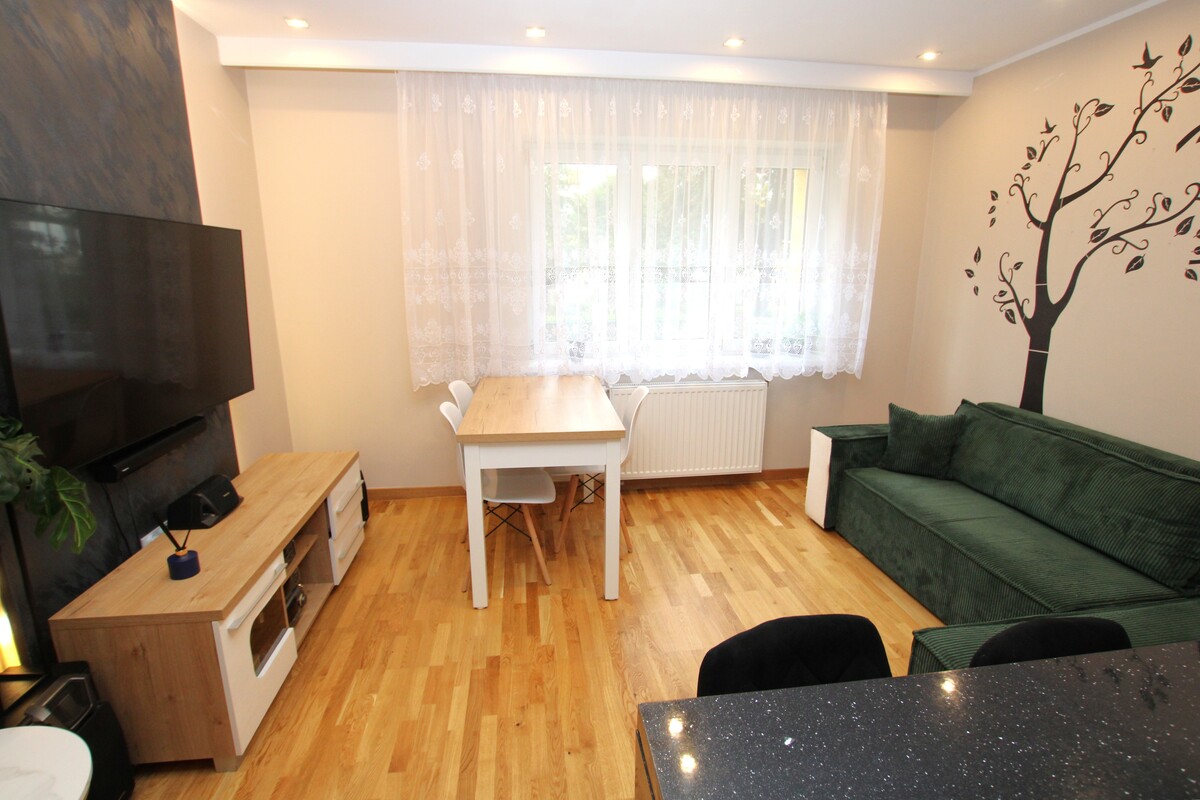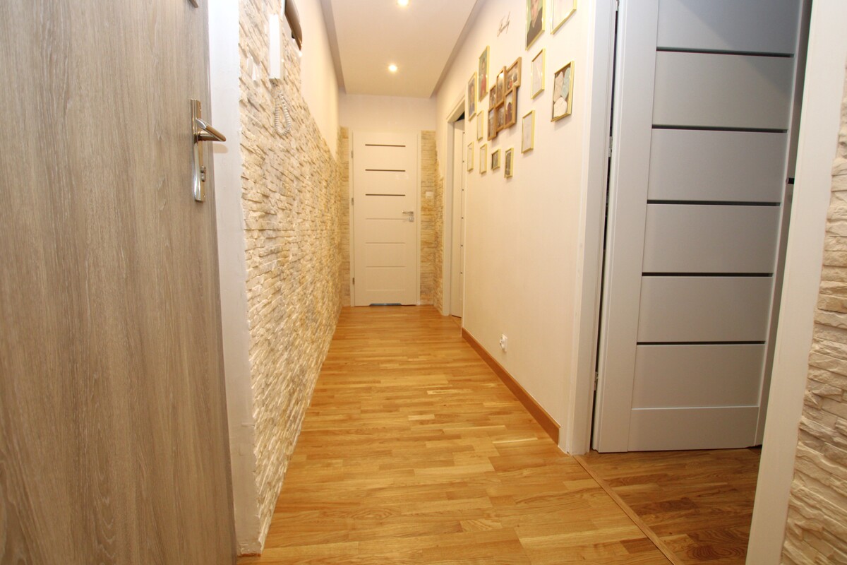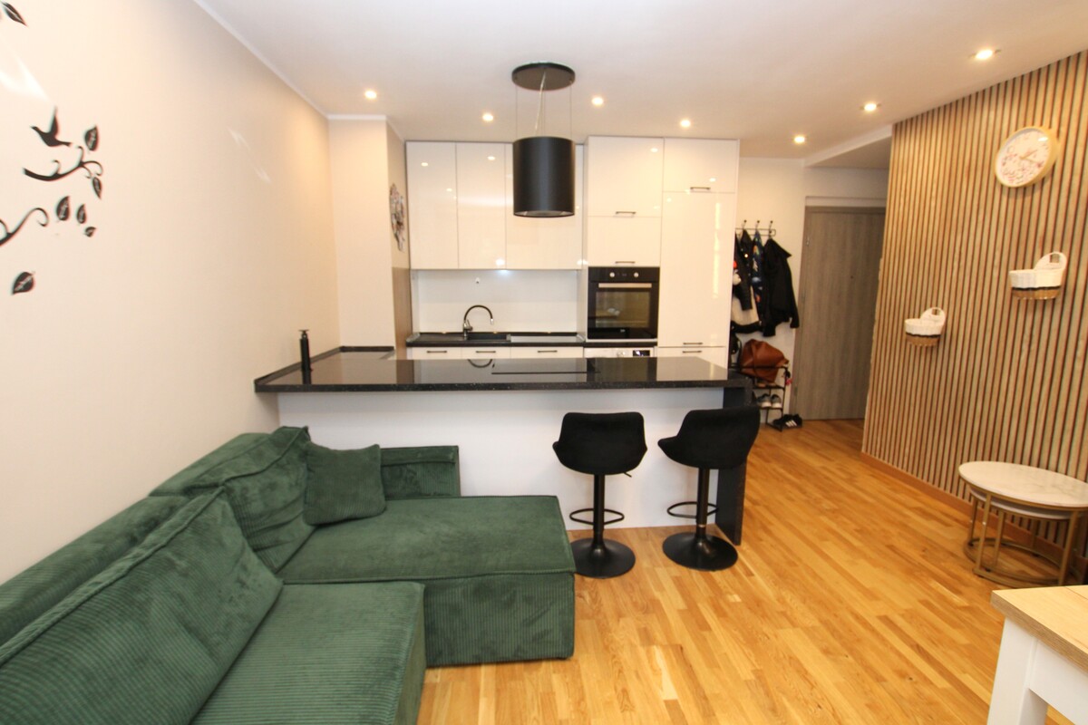 Otwarty salon z aneksem kuchennym: idealne serce domu, które sprzyja relaksowi i spotkaniom towarzyskim. Nowoczesna zabudowa kuchenna tworzy stylową i funkcjonalną przestrzeń do gotowania. Dwie odrębne sypialnie zapewniają prywatność i komfort. Jedna z nich posiada pojemną szafą garderobianą. Łazienka z oknem: pokryta modną, nowoczesną glazurą i terakotą w odcieniach szarości. Wyposażona w kabinę prysznicową typu walk-in oraz funkcjonalną szafkę z umywalką nadblatową. Wysoka jakość wykończenia mieszkania: na podłogach doskonale utrzymana deska barlinecka.