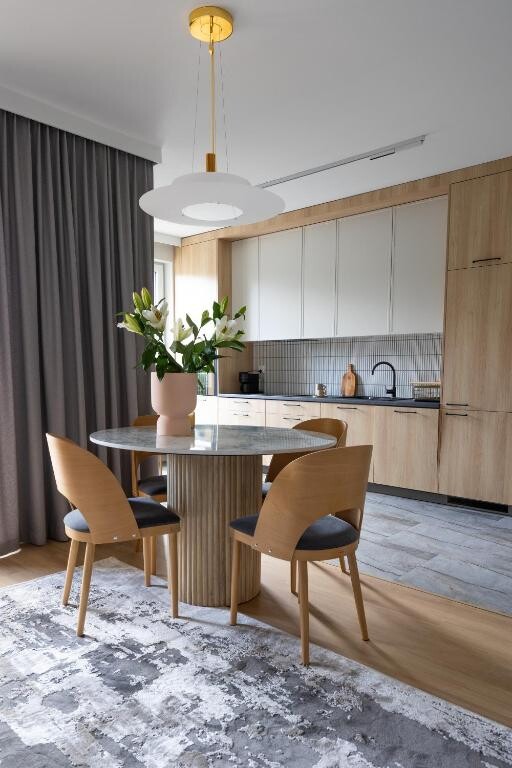Wnętrza zostały zaprojektowane przez biuro projektowe i wykończone z wysokiej jakości materiałów. Mieszkanie zostało starannie zaplanowane i dopracowane pod względem funkcjonalności oraz estetyki, dzięki czemu tworzy nowoczesną i komfortową przestrzeń do życia.