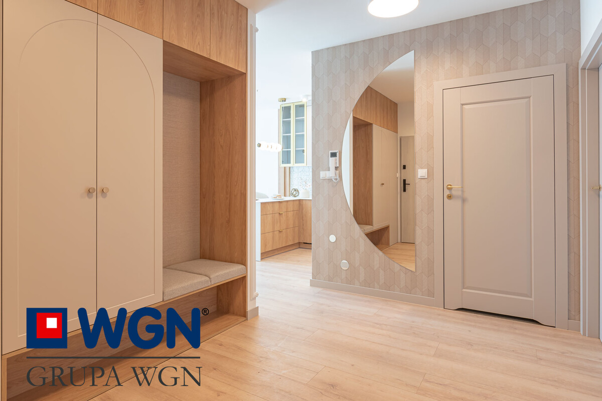 W przedpokoju mamy dużą, przestronną szafę z ryflowanymi frontami i stylowym siedziskiem. Dodatkowo na ścianie przygotowano duże lustro na wymiar wykonane przez szklarza oraz tapetę marki ADAWALL. Drzwi wewnętrzne DRE, model NESTOR 12 bezprzylgowe, płytowe, wykończone folią w kolorze KASZMIR. Panel laminowany klasy AC5.