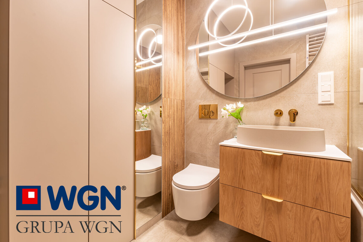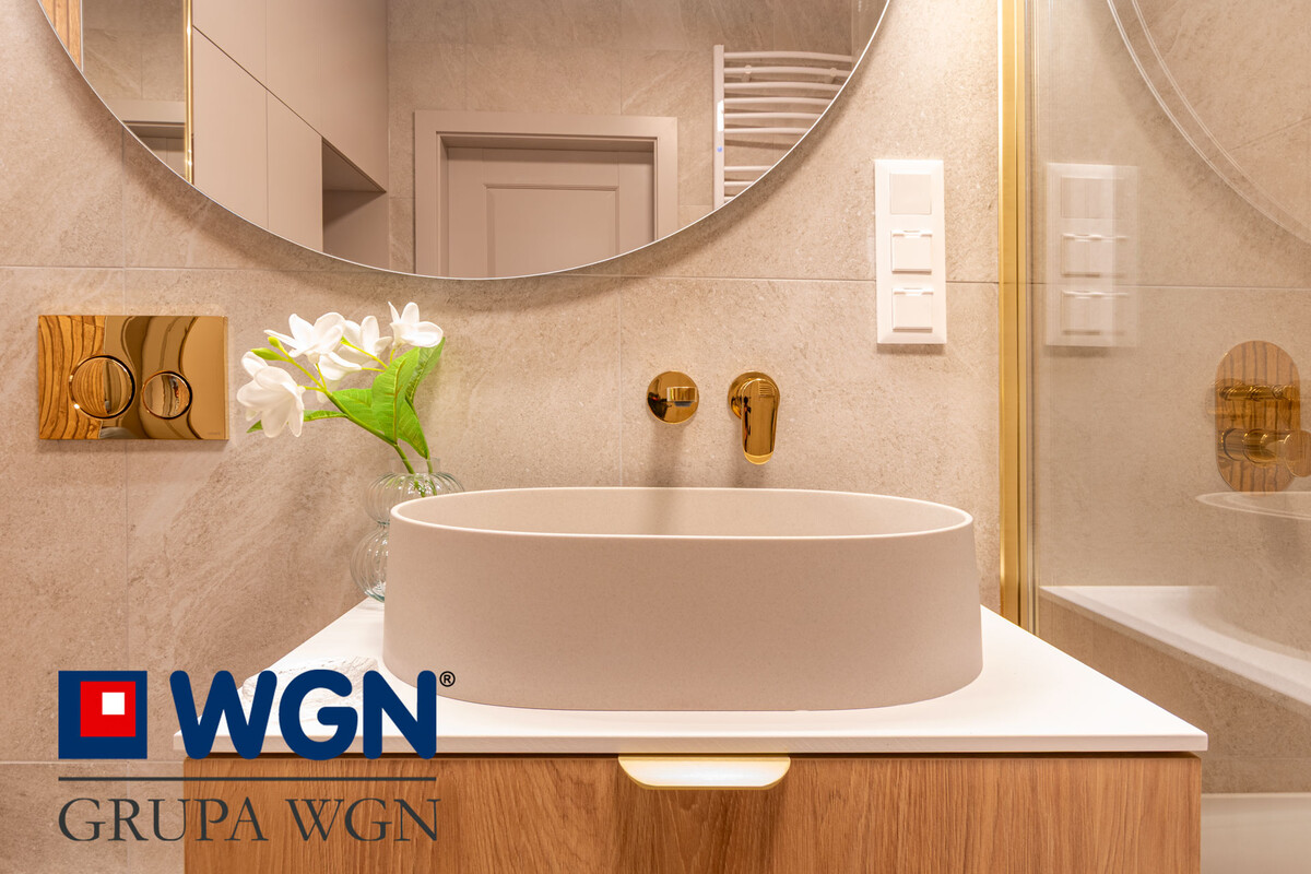 Łazienka z wc o wielkości ok 5,7m2,w której wykonano szafkę z umywalką i lustro z podświetleniem. Dodatkowo duża szafa to idealne rozwiązanie, aby wszystko co potrzebne znalazło swoje miejsce. Obok szafy znajduje się miejsce na pralkę, lub pralko-suszarkę. Całość dopełnia duża wanna z parawanem i dodatkową deszczownicą, dzięki której niezależnie, czy lubisz się kąpać w wannie, czy brać prysznic, każda z tych opcji jest tutaj dostępna, wszystko z firmy CERSANIT. Warto zwrócić uwagę na zastosowane nowoczesne rozwiązania podtynkowe firmy Cersanit. Wykończenie łazienki płytkami firmy OPOCZNO. Łazienka posiada ogrzewanie podłogowe.