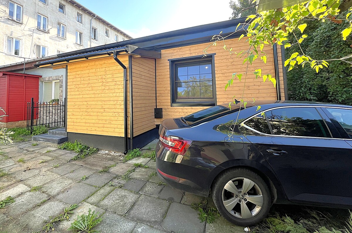 Mieszkanie składa się z dwóch pokoi z otwartą kuchnią, łazienki oraz wiatrołapu. Dodatkowo przynależy do niego niewielki garaż oraz dostęp do ogródka. Lokal jest swoistą perełką i stanowi oryginalną propozycję na rynku elbląskim, ponieważ – mimo że sprzedawany jest jako mieszkanie z niskim czynszem na parterze – może spełniać również, pod pewnymi względami, parametry tzw. szeregowca z miejscem do parkowania samochodu tuż przy wejściu do lokalu.