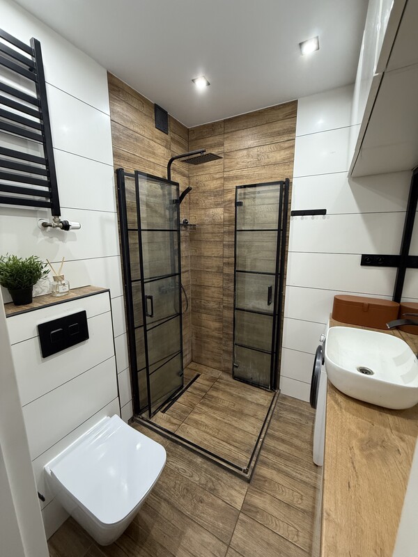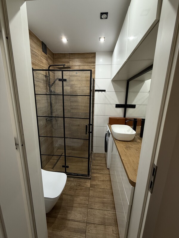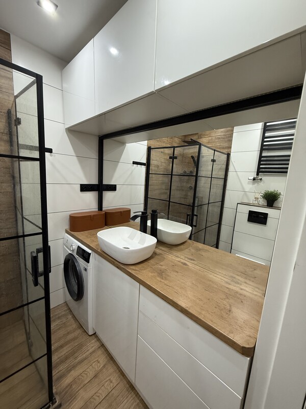 🛀 Łazienka z indywidualnego projektu, prysznic z odpływem liniowym, zabudowa od stolarza, pralka