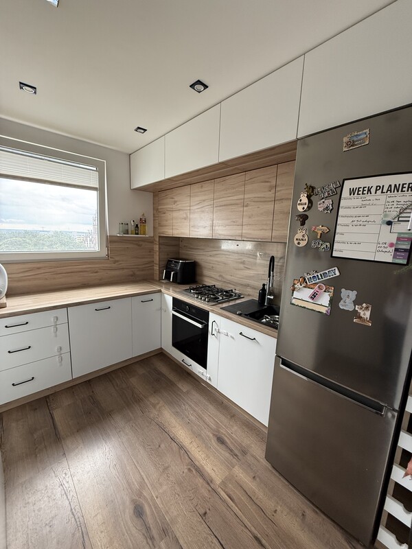Prywatne mieszkanie z oddzielną kuchnią na osiedlu Zawadą, ulica Kasprzaka, 47,7 m², po generalnym remoncie, wykończone w wysokim standardzie w odcieniach bieli, beżu i drewna z czarnymi dodatkami.