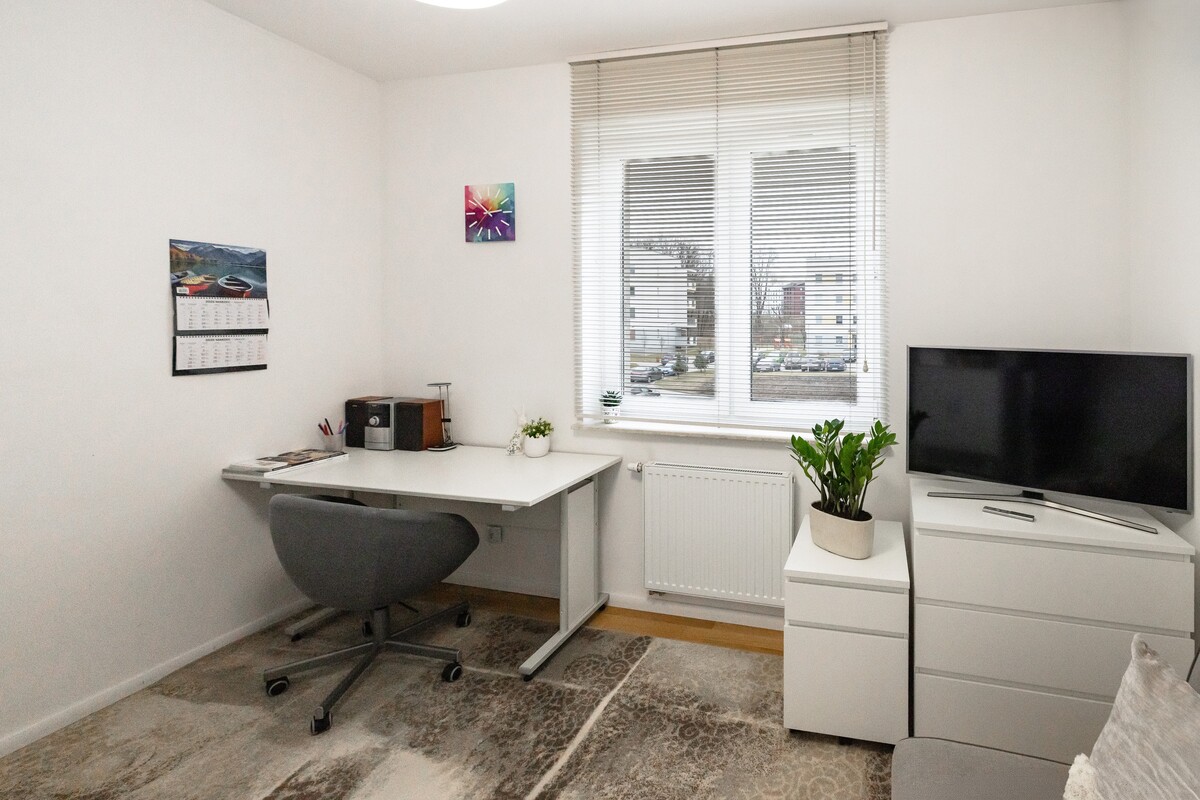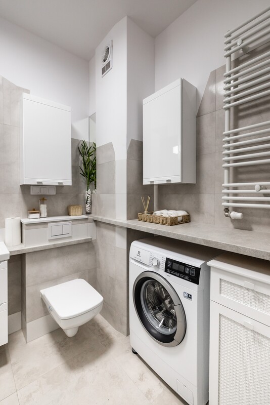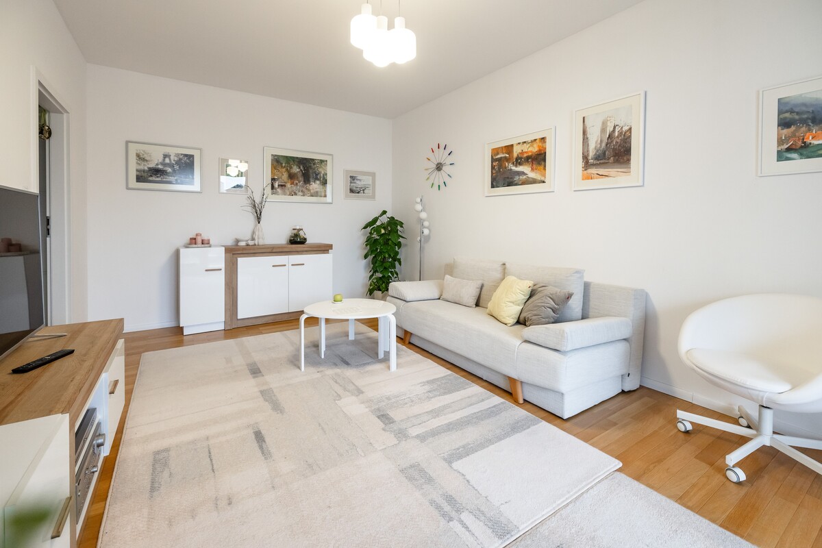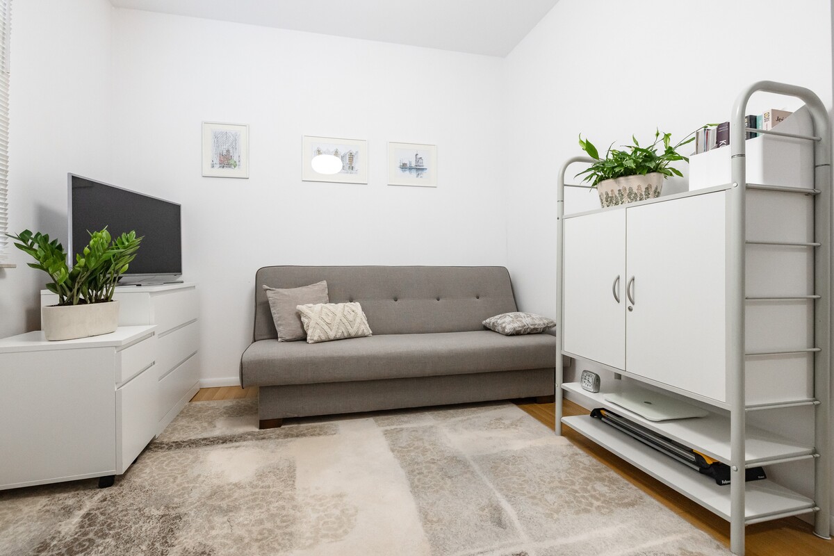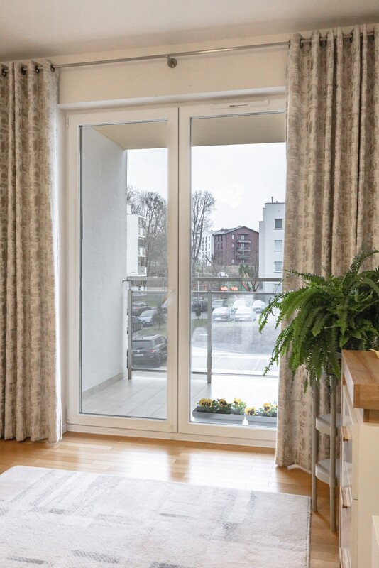 Na powierzchnię 53,77 m2 składają się: salon z wyjściem na duży balkon, sypialnia-gabinet, osobna kuchnia, przedpokój z pojemnymi szafami oraz łazienka z kabiną prysznicową.
