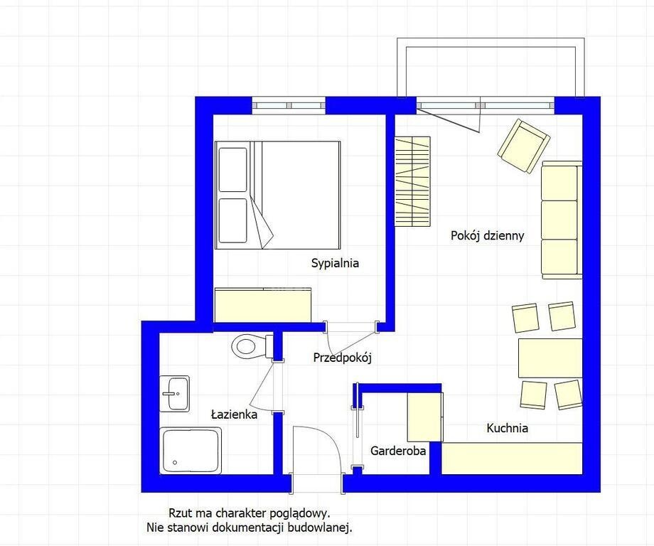 Układ: salon z aneksem kuchennym, sypialnia, łazienka, przedpokój