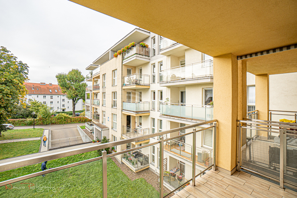 Balkon to prawdziwe przedłużenie salonu – zadaszony, przestronny i wykończony płytkami drewnopodobnymi. Balustrada ze szkła i stali nierdzewnej podkreśla nowoczesny styl budynku. Widok na zielony dziedziniec oraz starannie utrzymane otoczenie sprawiają, że to idealne miejsce na poranną kawę lub wieczorny relaks.