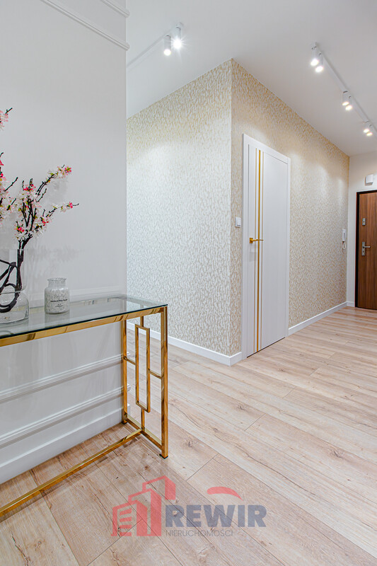 W przedpokoju znajduje się duża szafa z ryflowanymi frontami i stylowym siedziskiem. Dodatkowo na ścianie przygotowano lustra na wymiar wykonane przez szklarza oraz tapetę ADAWALL VERA. W przedpokoju znajduje się również konsola oraz listwy sztukateryjne MARDOM DECOR.