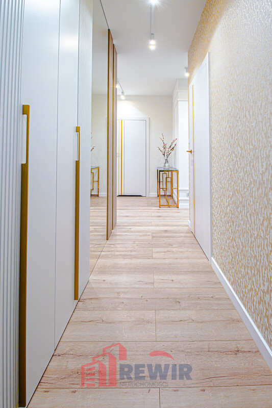 W przedpokoju znajduje się duża szafa z ryflowanymi frontami i stylowym siedziskiem. Dodatkowo na ścianie przygotowano lustra na wymiar wykonane przez szklarza oraz tapetę ADAWALL VERA. W przedpokoju znajduje się również konsola oraz listwy sztukateryjne MARDOM DECOR.