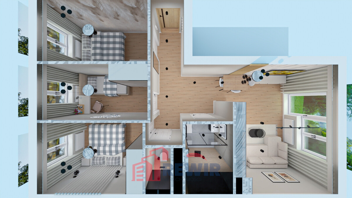 Łączna powierzchnia nieruchomości wynosi 59,60 m2,na które składają się: salon z aneksem kuchennym i wyjściem na balkon, 3 sypialnie, łazienka z dużą kabiną prysznicową, wc oraz przedpokój.