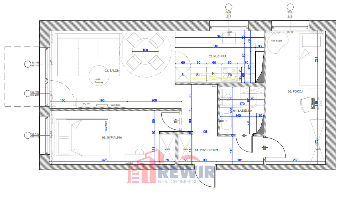 - salon z aneksem kuchennym z wyjściem na balkon,