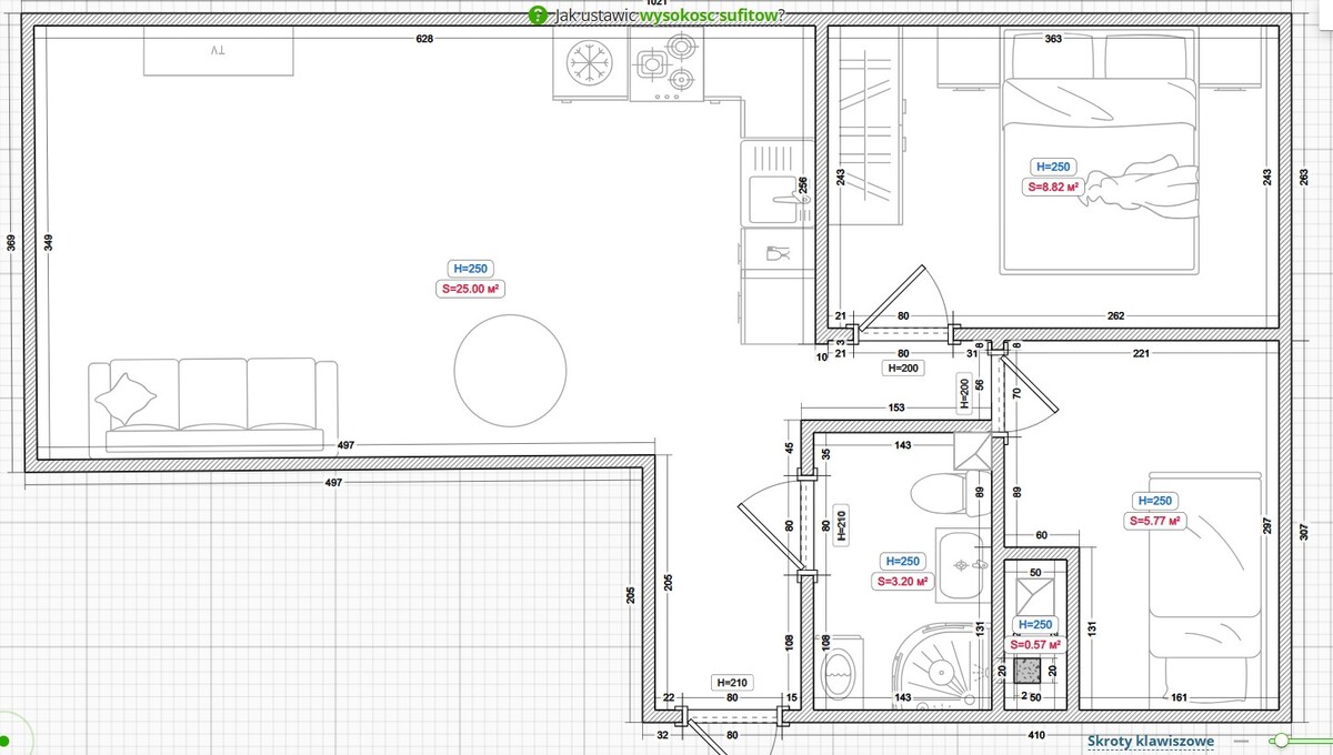 - 3 niezależne pokoje: salon z aneksem kuchennym + 2 sypialnie