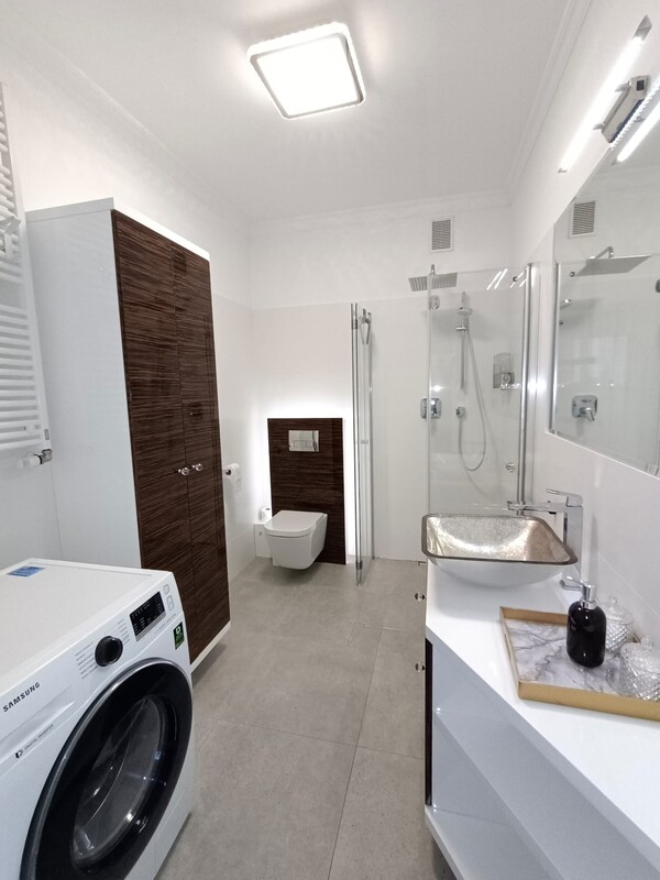 Proponujemy Państwu do wynajęcia luksusowo wykończony apartament, położony na Starym Mieście. Lokal o pow.40,50 m2 znajduje się na IV piętrze w budynku z windą. Z balkonu rozpościera się piękny widok na rzekę Elbląg, katedrę, plac z fontannami. Mieszkanie zostało wyposażone w zabudowę kuchenną z kamiennymi blatami, dużą lodówko - zamrażarkę, zmywarkę, piekarnik, mikrofalówkę, płytę indukcyjną, ekspres do kawy. W części wypoczynkowej znajduje się rozkładana kanapa, stolik kawowy oraz telewizor. Pojemna szafa z drzwiami lustrzanymi w której wykorzystano miejsce na chowane podwójne łóżko z materacem ( bardzo podręczny i lekki system ). Łazienka wyposażona w pralko - suszarkę z kabiną prysznicową. Dodatkowe opłaty to czynsz 485 zł ( zaliczka na wodę i opata za śmieci za 1 osobę). Kaucja zabezpieczająca 3.000 zł. Mieszkanie skierowane do jednej osoby bądź pary, pracującej ( bez zwierząt ). Istnieje możliwość korzystania z pakietu telewizji ( 80 kanałów ) i internetu za dodatkową opłatą 105 zł.
