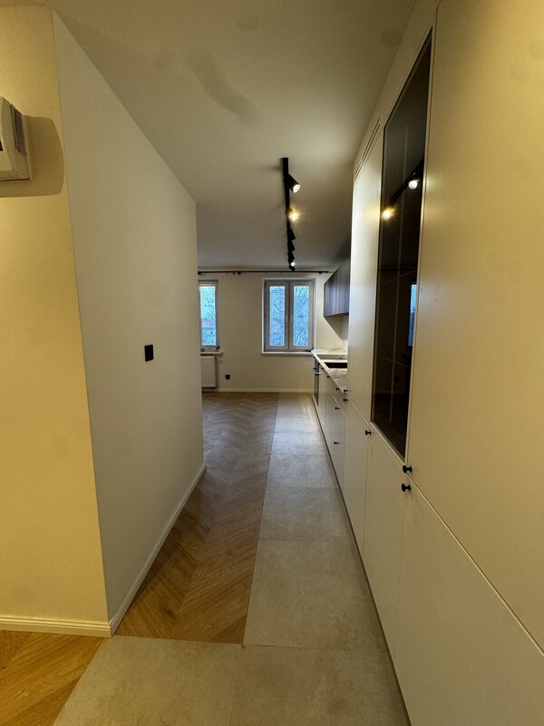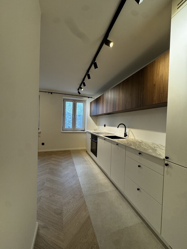 Mieszkanie zostało wykończone z dbałością o detale, z użyciem materiałów najwyższej jakości. Wnętrze łączy nowoczesny design z klimatem kamienicy.