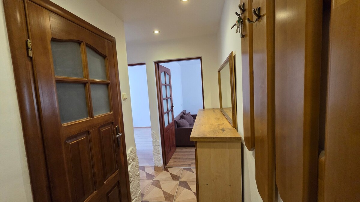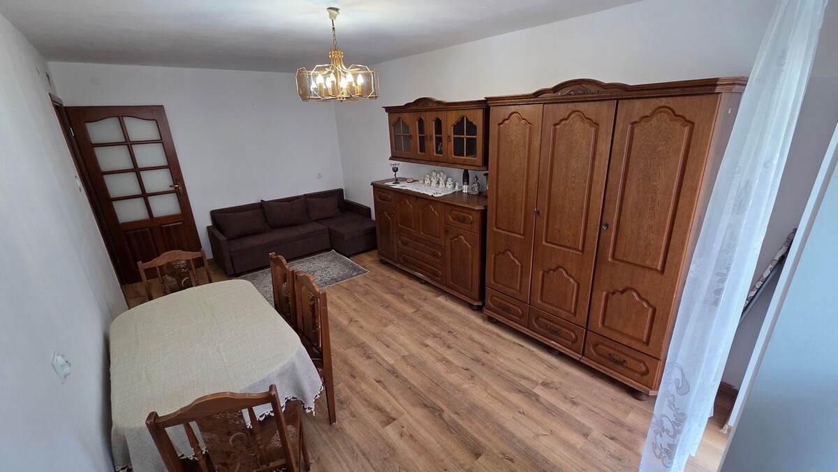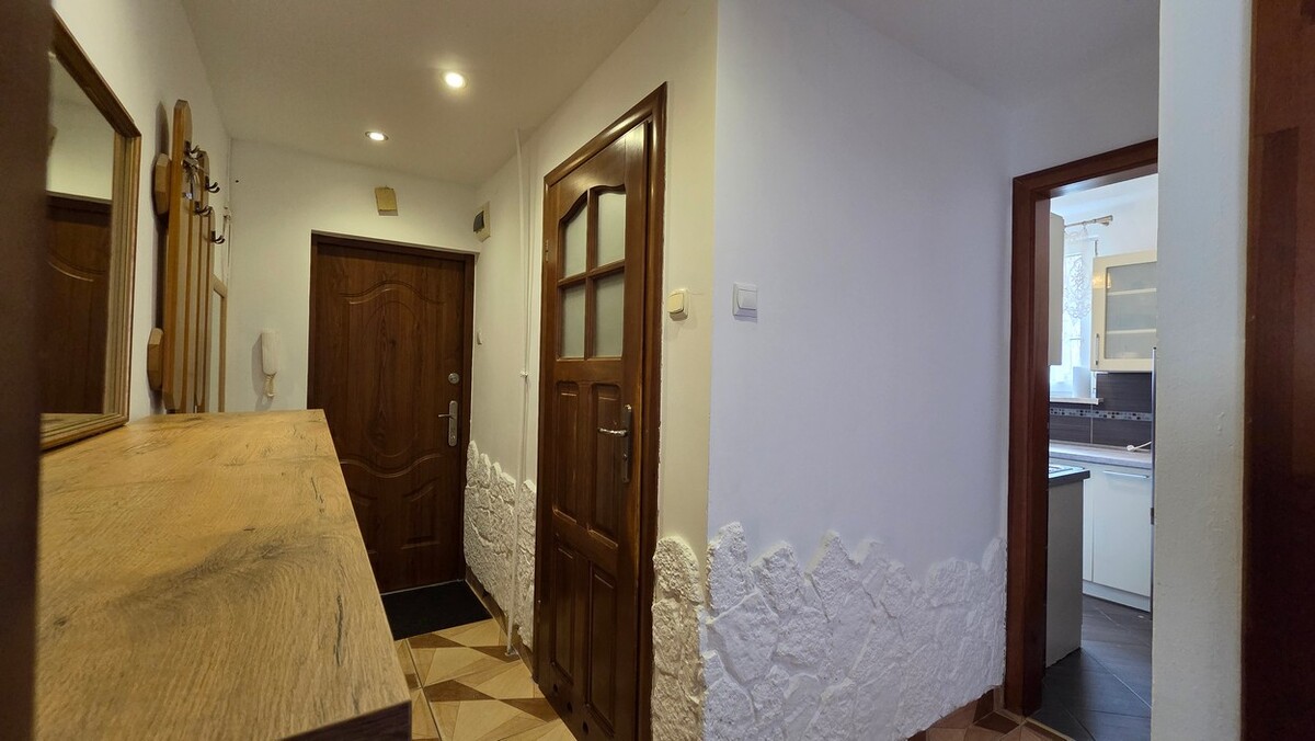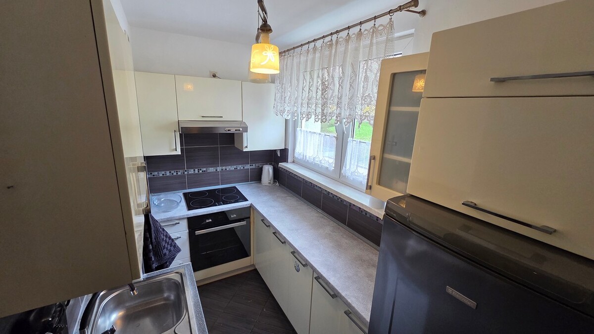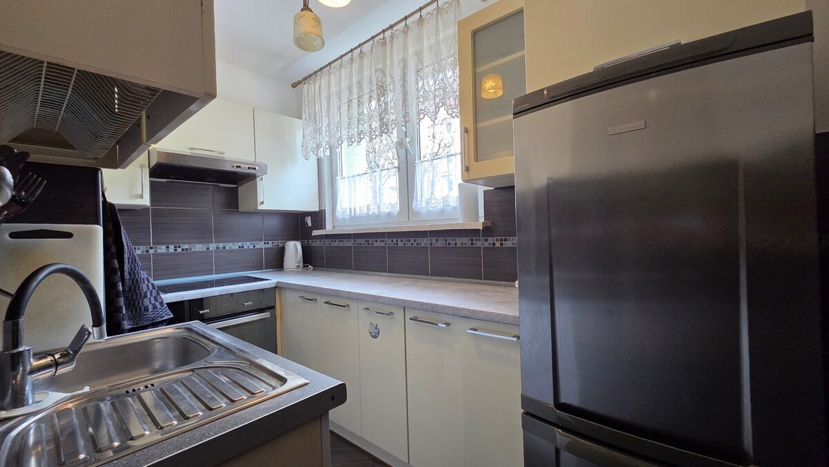 2 pokoje, oddzielna kuchnia w zabudowie, lodówka, płyta elektryczna z piekarnikiem, łazienka z WC, przedpokój oraz piwnica.