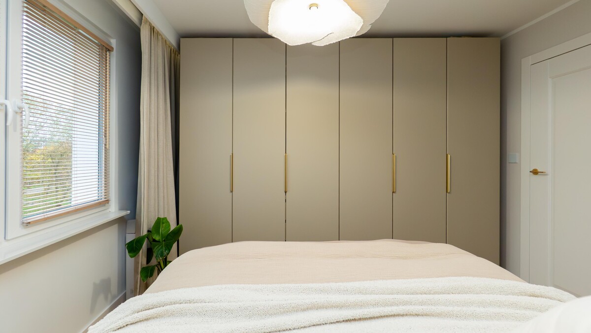 Sypialni z dużym łóżkiem z funkcją przechowywania oraz pojemną szafą w zabudowie z oświetleniem LED.