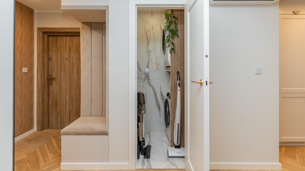 Pomieszczenia gospodarczego niezwykle praktyczna przestrzeń, w której zainstalowano pralkę, suszarkę oraz liczne półki do przechowywania.