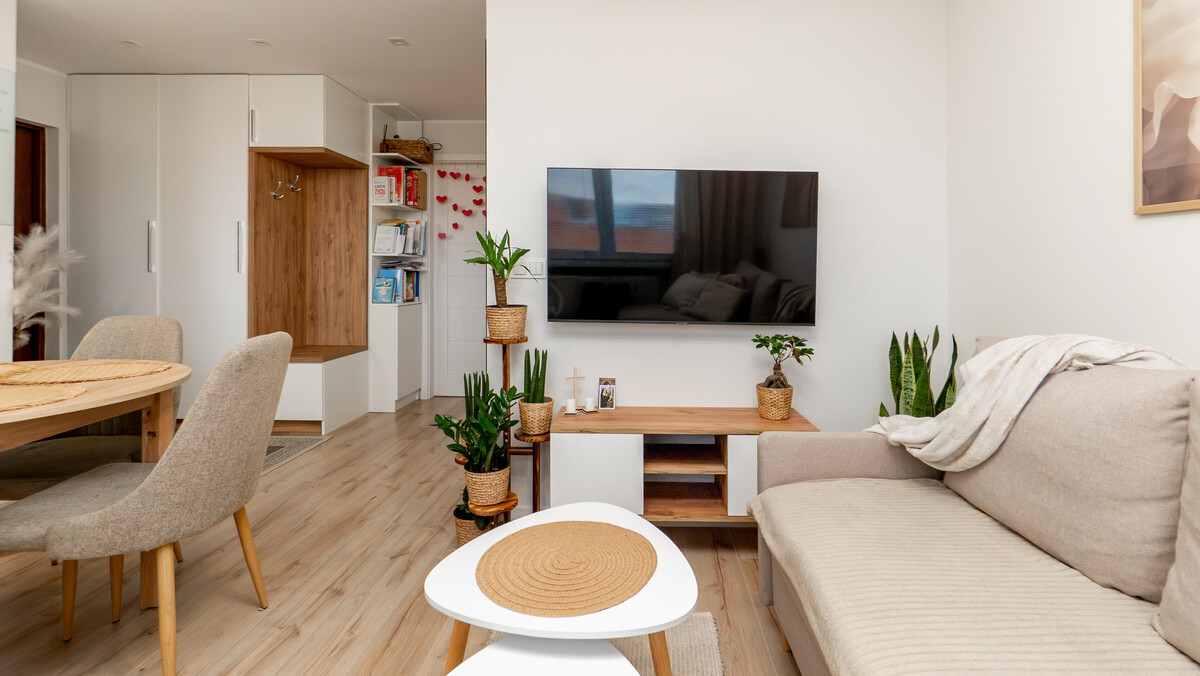Mieszkanie, w którym światło o poranku delikatnie wypełnia salon, a wieczorem zachodzące słońce otula sypialnię ciepłą barwą.
