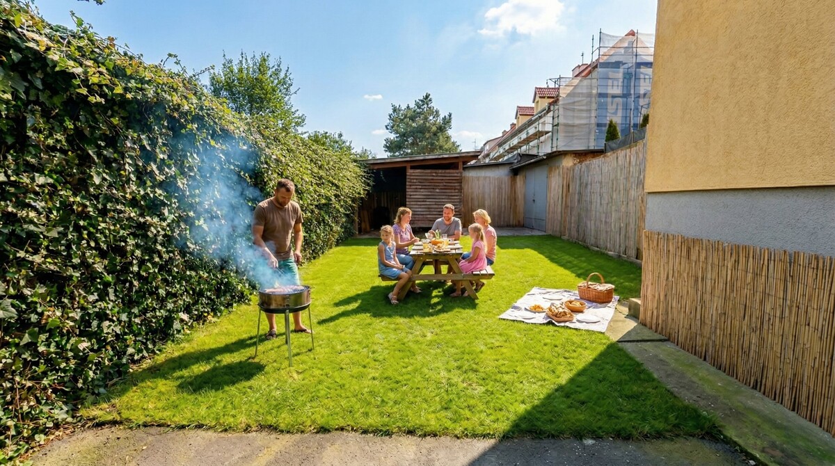 Dzieci już nie siedzą przy ekranach – wybiegają do własnego ogródka. Słychać śmiech, piłkę odbijającą się o trawę, pierwsze rozmowy sąsiadów.