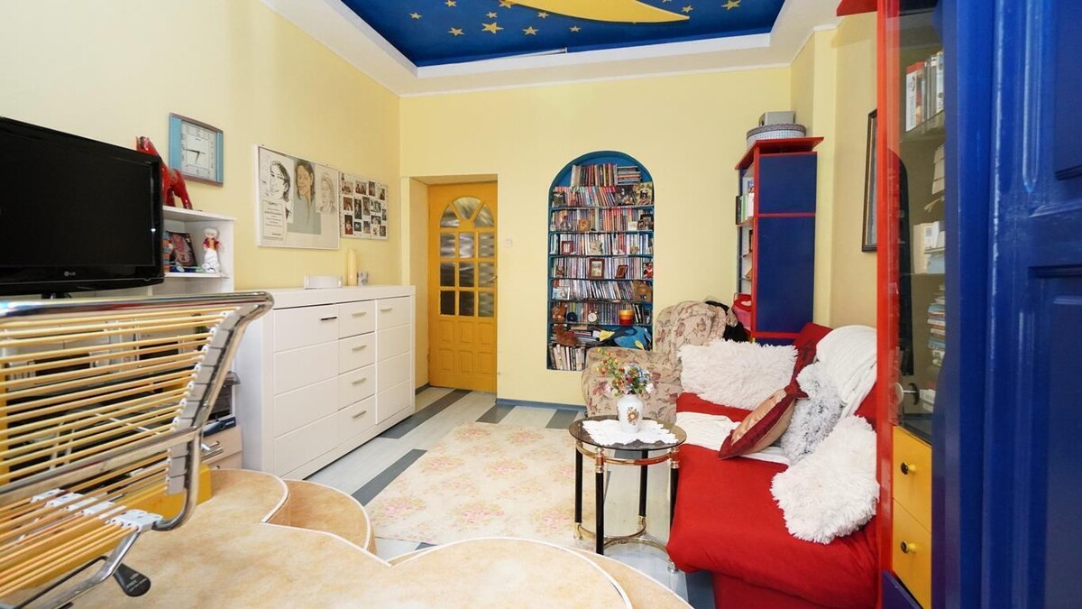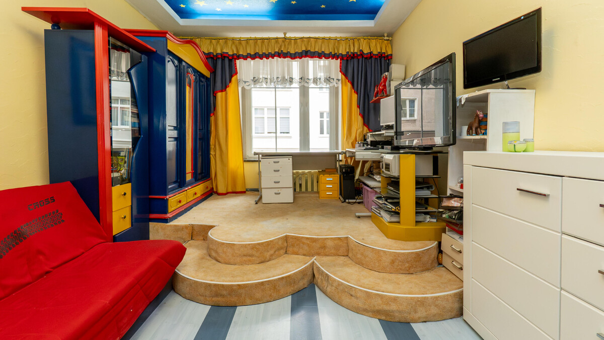 Każdy z pokoi ma swój niepowtarzalny charakter – pokój dziecięcy z podwyższeniem oferuje doskonałe światło do nauki i pracy, natomiast pokój po przeciwnej stronie mieszkania stanowi idealną, cichą sypialnię sprzyjającą wypoczynkowi.