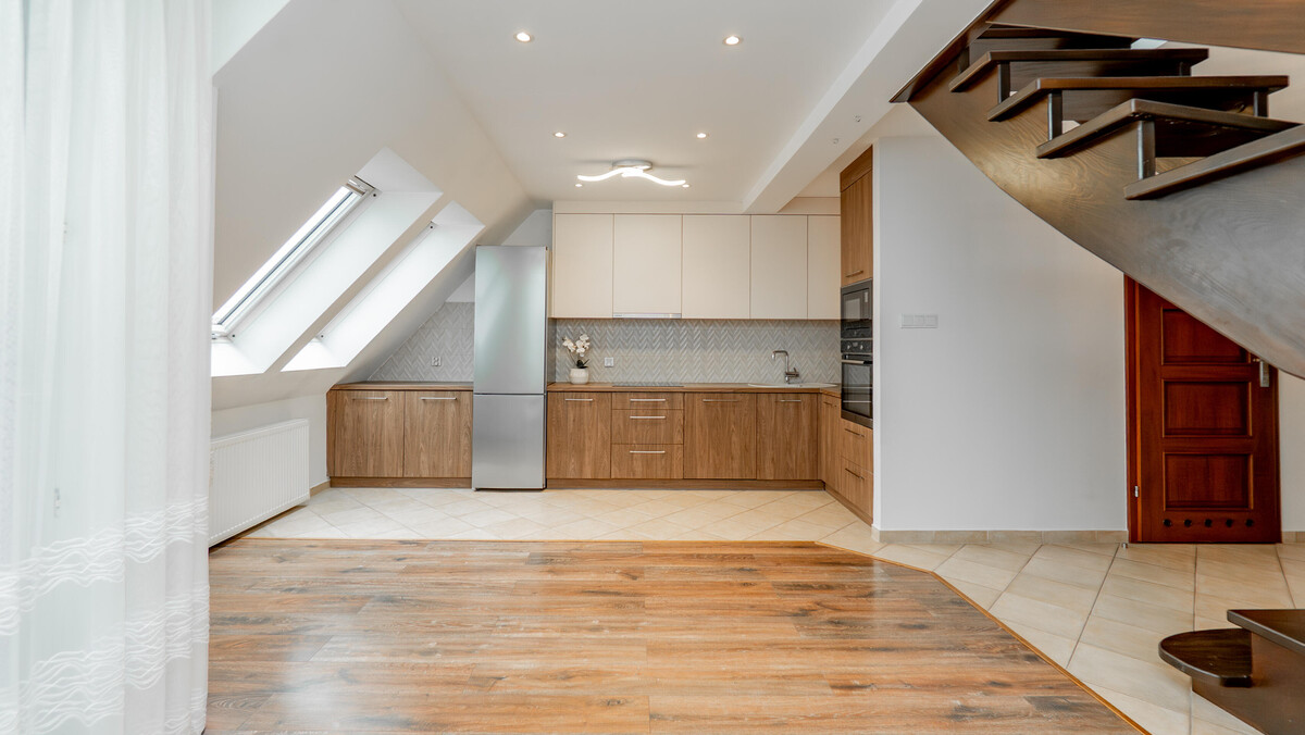 Schody prowadzą wyżej — do przestrzeni, która daje wolność. Antresola z potencjałem aranżacyjnym oraz wyjątkowa sypialnia z prywatną łazienką tworzą niemal osobny świat.
