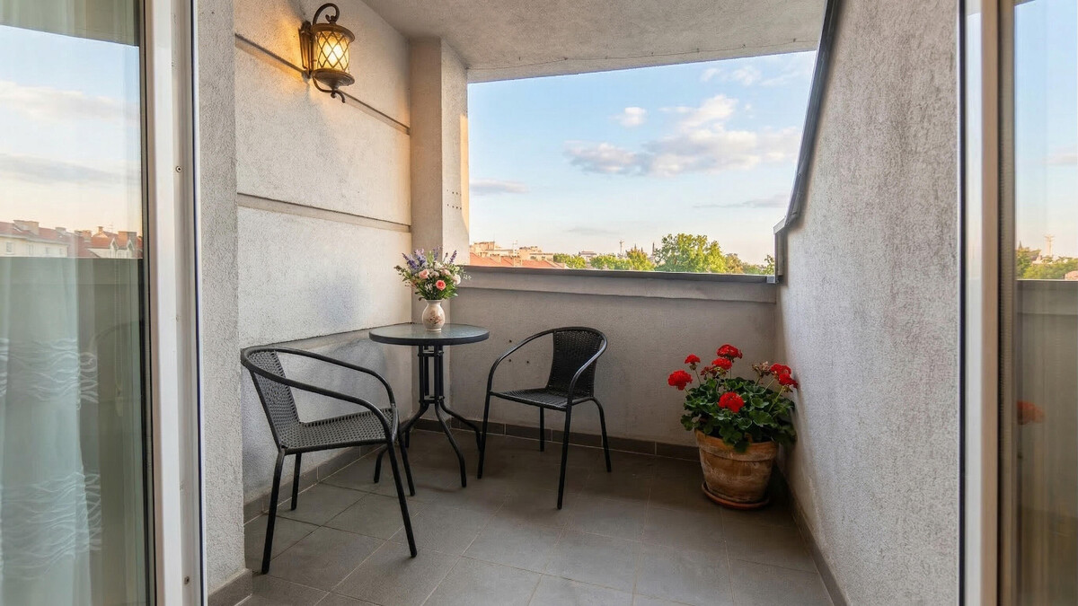 Już od progu wyczuwalna jest harmonia i przemyślany układ. Salon z aneksem kuchennym tworzy naturalne centrum codzienności — przestrzeń, w której światło miękko rozlewa się po wnętrzu, a każda chwila, od porannej kawy po wieczorny relaks, nabiera wyjątkowego rytmu. Z salonu wychodzisz na loggię — intymną, zaciszną, niemal ukrytą przed światem.