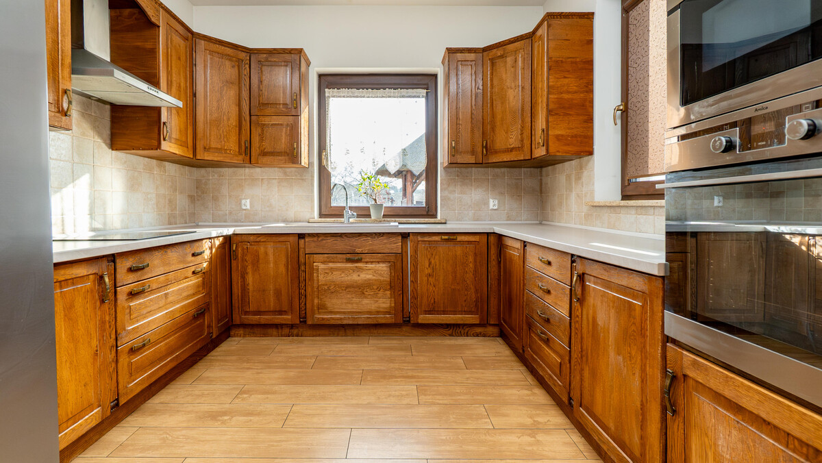 Serce domu stanowi jasny, przestronny salon, pięknie doświetlony naturalnym światłem, harmonijnie połączony z otwartą kuchnią utrzymaną w ciepłych, drewnianych tonacjach. To przestrzeń dzienna, która sprzyja wspólnemu spędzaniu czasu – zarówno w codziennym rytmie, jak i podczas wyjątkowych chwil. Centralnym punktem tej strefy jest kominek, przy którym można celebrować spokojne, nastrojowe wieczory, wsłuchując się w trzask ognia i ciesząc się ciszą oraz niezależnością, jaką daje to wyjątkowe miejsce.