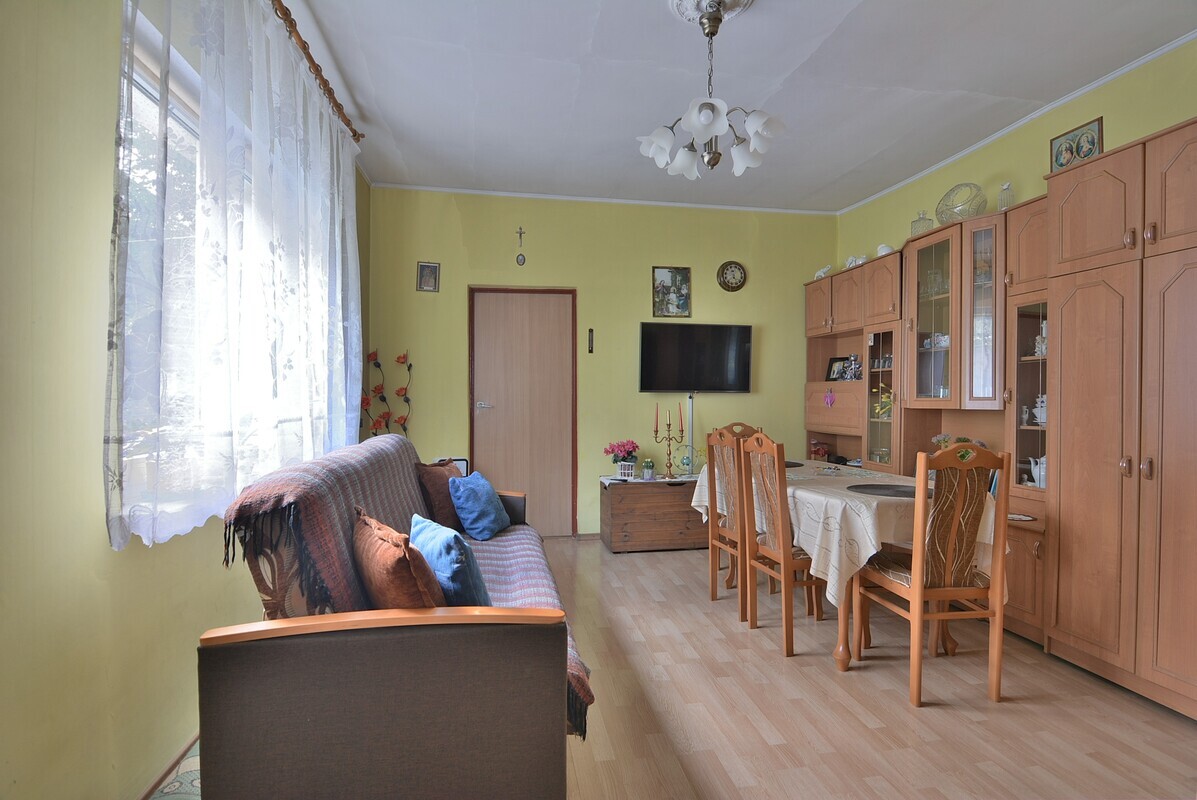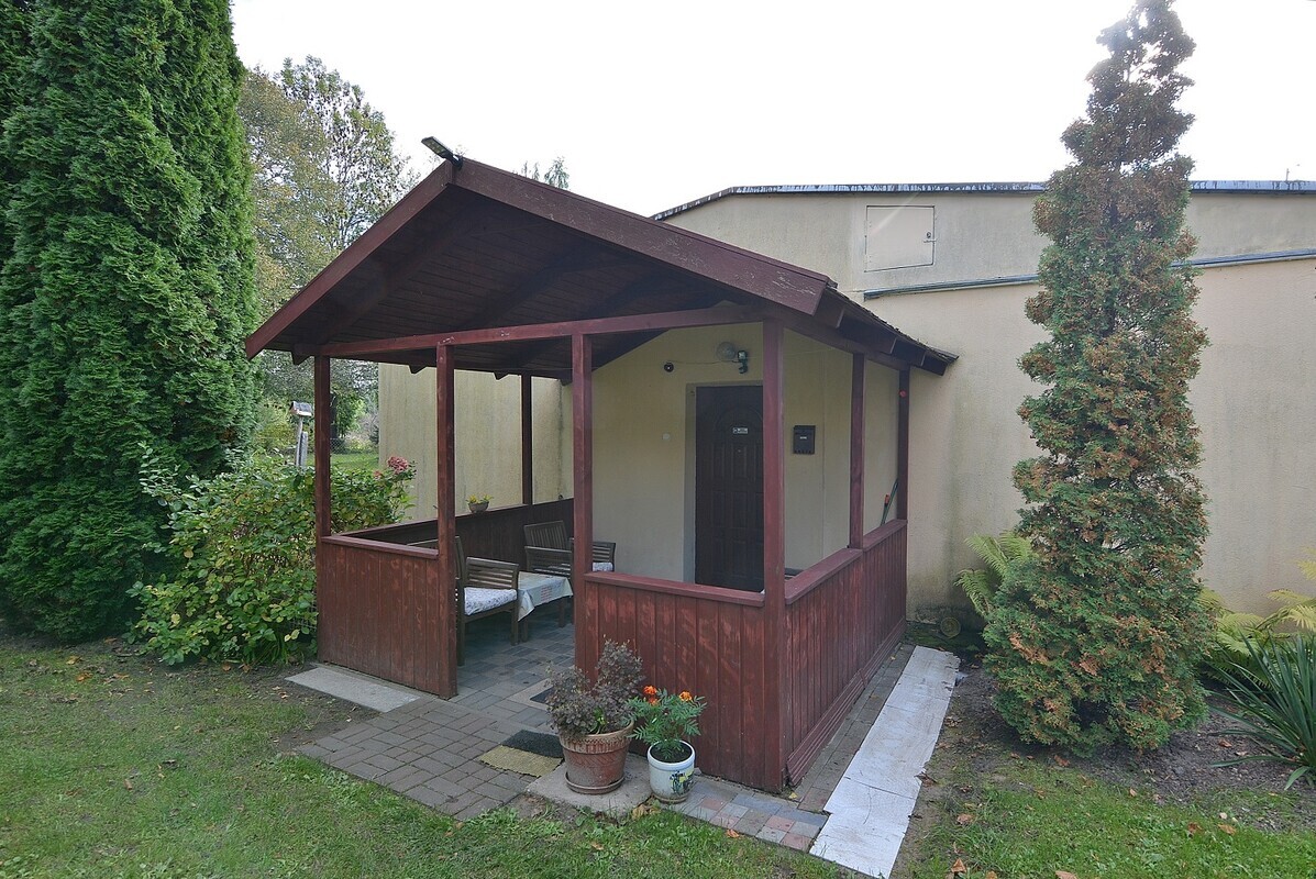 Parterowy ocieplony budynek w stanie dobrym zamieszkiwany przez cztery rodziny. Znajduje się na ogrodzonej działce, z zielonym terenem, której powierzchnia w ¼ części wspólnej przynależy do mieszkania, od strony wschodniej budynku za oknami mieszkania znajduje się przynależny do niego ogródek i murowany budynek gospodarczy, a od strony zachodniej sad z drzewostanem owocowym.