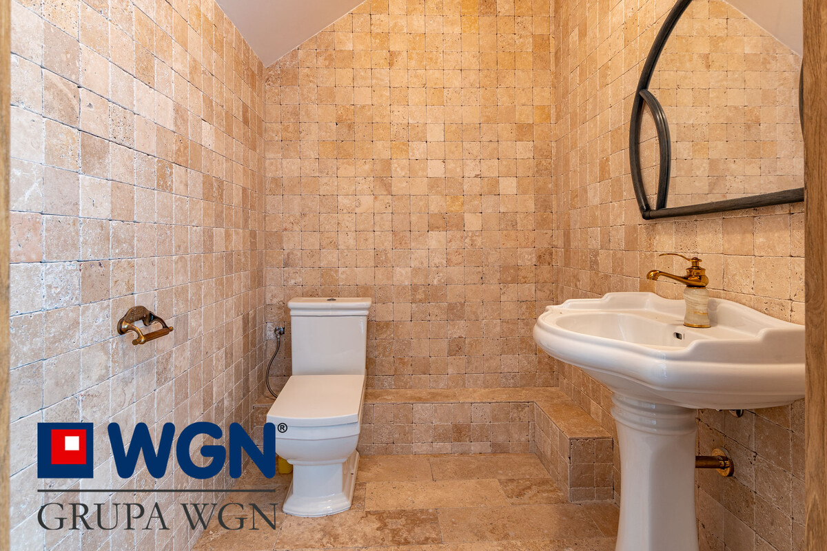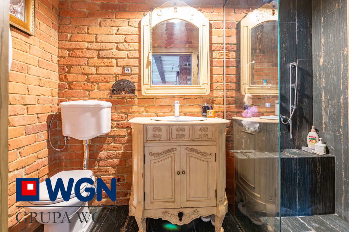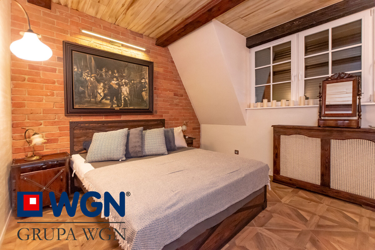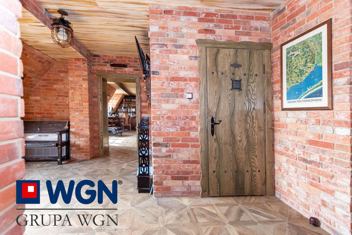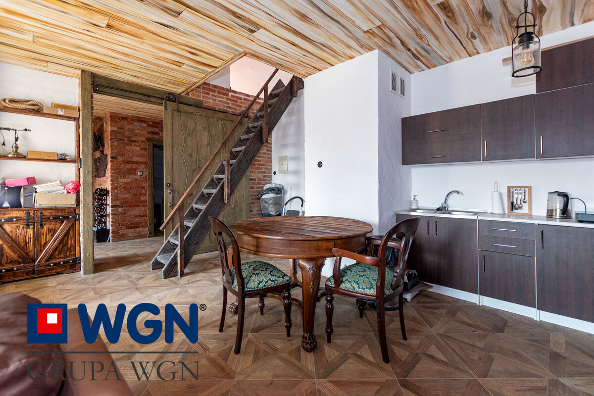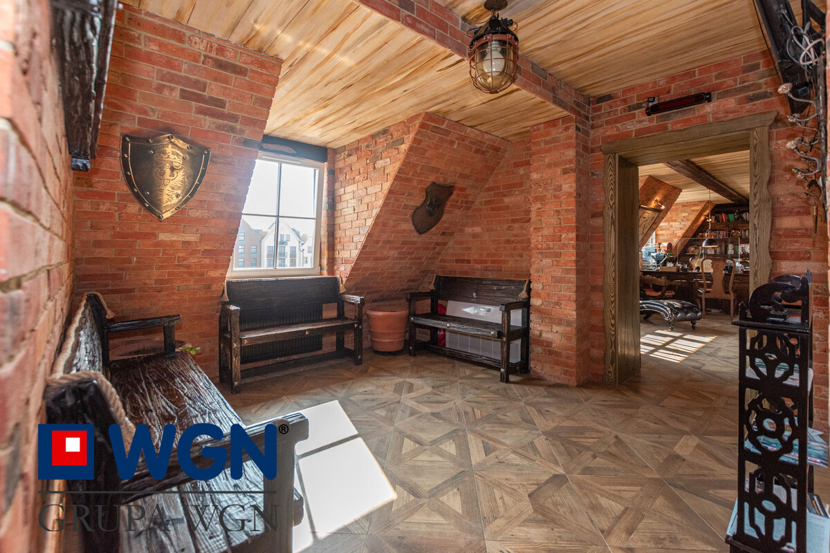 Mieszkanie wykończone w oryginalnym stylu z użyciem starannie dobranych materiałów jak na przykład gotycka cegła w dolnej łazience, trawertyn w górnej ubikacji, czy deska bambusowa na piętrze. Parter nieruchomości wyłożony cegłą i kaflami podłogowymi. Ozdobnymi akcentami są witraże, drzwi dębowe czy ręcznie malowane sufity imitujące deskę.