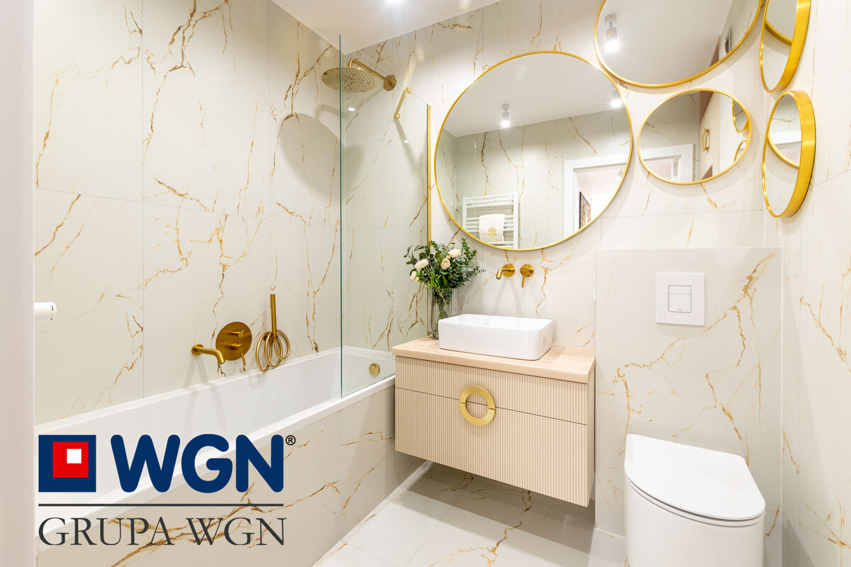 Z salonu mamy możliwość wyjścia na duży balkon o powierzchni 15,79m2, z którego rozpościera się piękny widok na tereny zielone w kierunku ulicy Druskiej. Taras to idealne miejsce na meble ogrodowe, spędzanie na nim wolnego czasu wraz z rodziną. Łazienka z wc, w której wykonano szafkę pod umywalkę i słupek w miejscu gdzie możemy umiejscowić pralkę i suszarkę. W łazience całość dopełnia wanna z parawanem. Klimatu nadają oprawy świetlne, lustra oraz duże kafle z elementami złota.