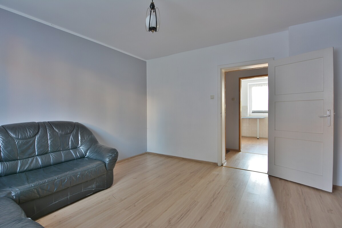 Trzypokojowe mieszkanie z funkcjonalnym rozkładem pomieszczeń o powierzchni 56,50 m2 w stanie do remontu. Wymaga wykonania centralnego ogrzewania z wykorzystaniem doprowadzonej do mieszkania instalacji gazowej, lub korzystania z obecnego ogrzewania na piec kaflowy. Ciepła woda na bojler elektryczny w łazience. Na podłogach panele, stolarka drzwiowa drewniana z szerokimi framugami. Okna PCV wyposażone w żaluzje typu dzień-noc, z ekspozycją wschód-zachód. Do mieszkania przynależy piwnica o powierzchni 9,1 m2. Atrakcyjna oferta dla rodziny lub inwestora, poszukującego nowej inwestycji. Cena do negocjacji. Należy przy niej uwzględnić koszty notarialne i prowizję dla biura nieruchomości. Nasz doradca kredytowy pomoże w przypadku zakupu tej nieruchomości na kredyt.