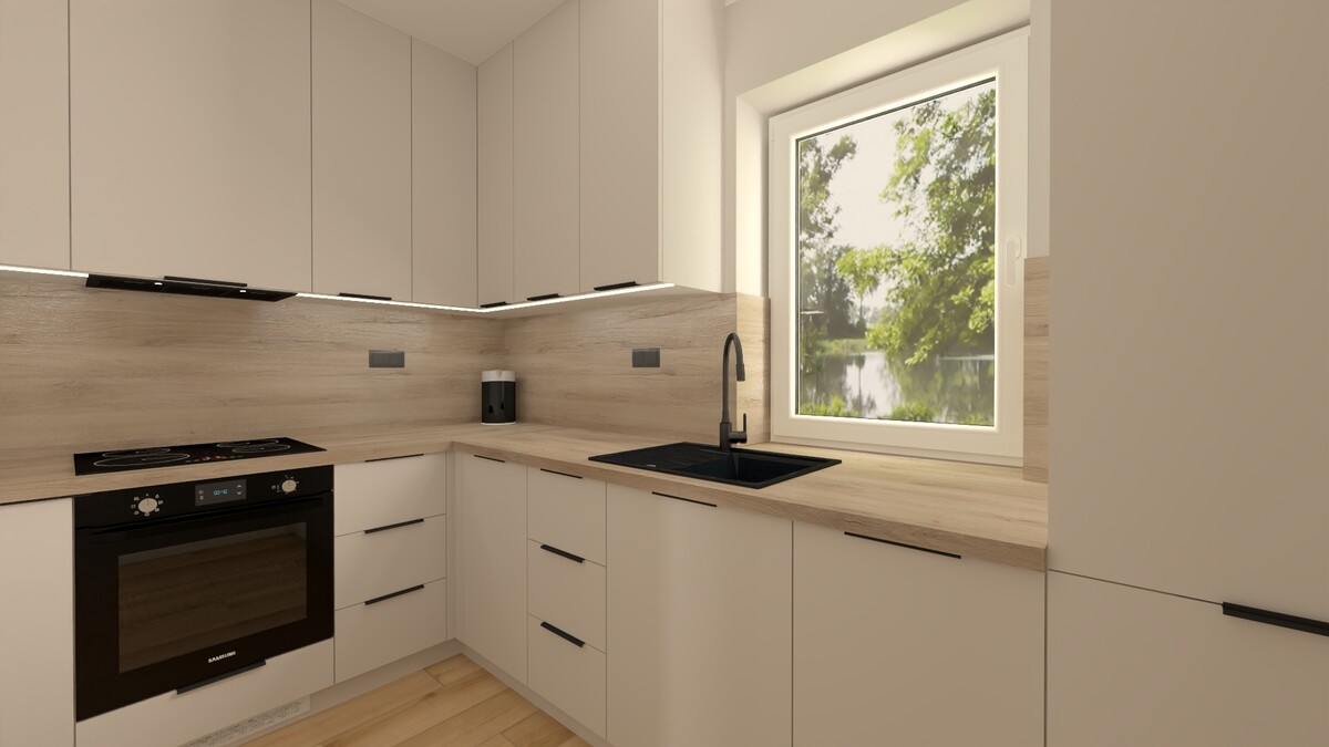 · oddzielnej kuchni z przygotowaną na wymiar przez stolarza zabudową kuchenną, rozplanowaną tak aby blat roboczy spełnił oczekiwania każdego amatora kulinarnego, a ilość szafek do przechowywania była wystarczająca.
