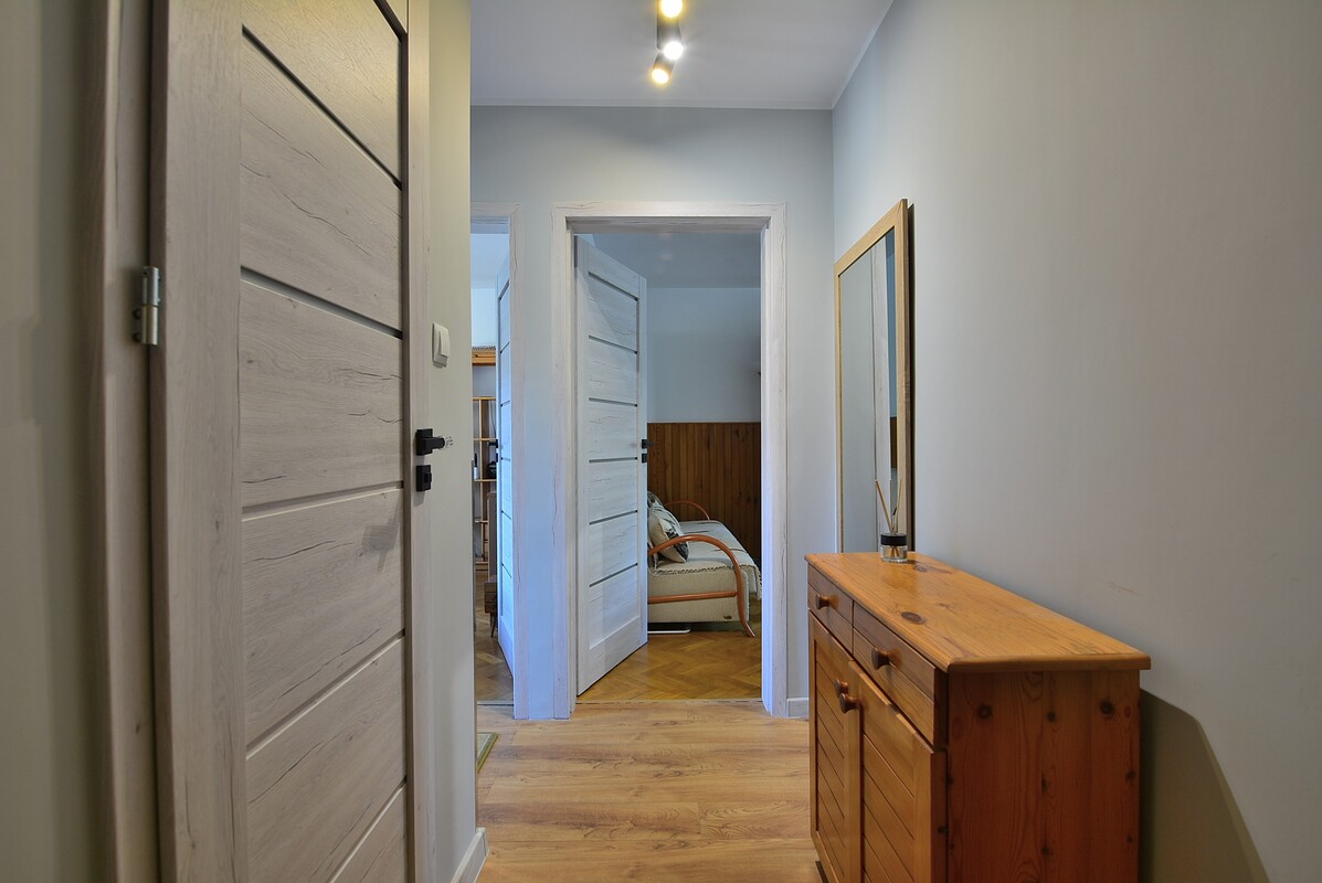 Dwustronne mieszkanie o powierzchni 43 m2, znajdujące się na parterze czteropiętrowego budynku. Składa się z: