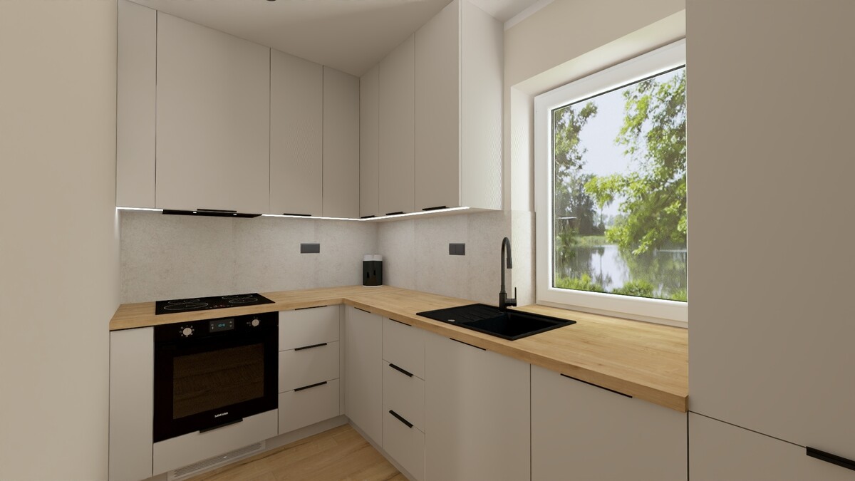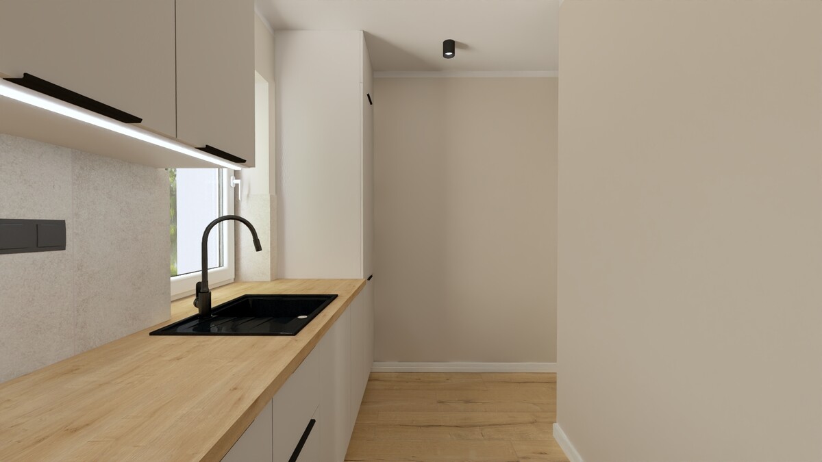 - Oddzielnej kuchni z przygotowaną na wymiar przez stolarza zabudową kuchenną, rozplanowaną tak aby blat roboczy spełnił oczekiwania każdego amatora kulinarnego, a ilość szafek do przechowywania była wystarczająca. Kuchnia nie posiada sprzętów AGD tylko zlew i okap.