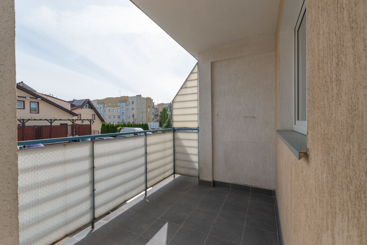 - przestronnego salonu z aneksem kuchennym, z wyjściem na balkon,