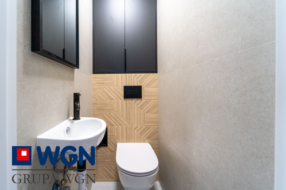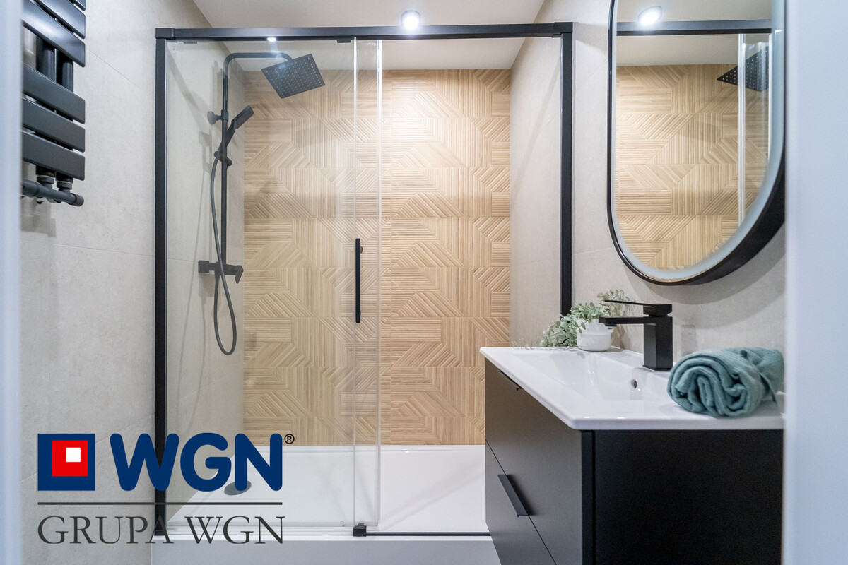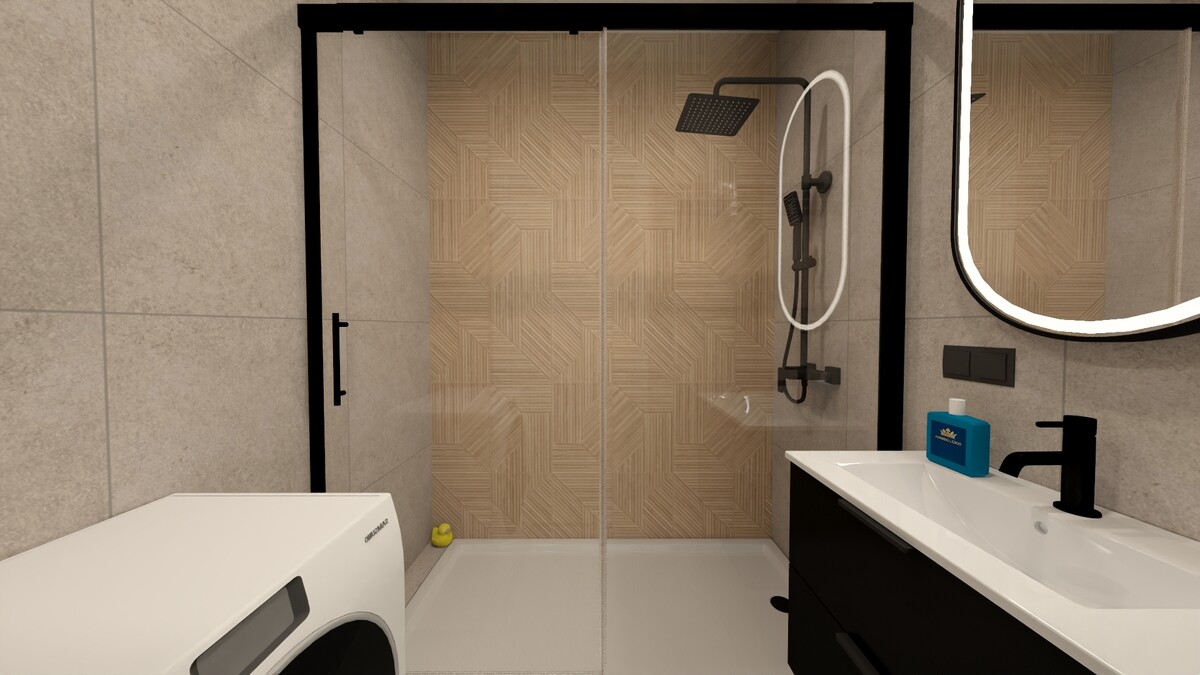 Łazienka z czarną armaturą, oraz prysznicem. Toaleta osobno od łazienki, zabudowana geberitem. Całość mieszkania jest spójna, estetyczna i ponadczasowa, zastosowano tam jasną kolorystykę, aby stworzyć miejsce idealne do odpoczynku dla całej rodziny.