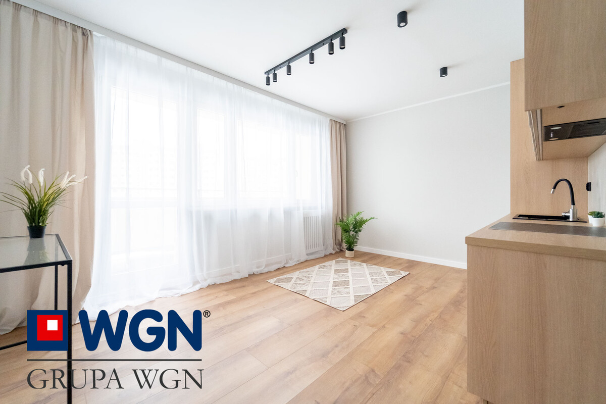 · przestronny salon z aneksem kuchennym i wyjściem na balkon