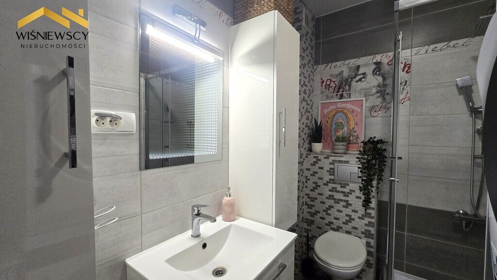 Łazienka oraz przedpokój – praktyczny układ na co dzień.