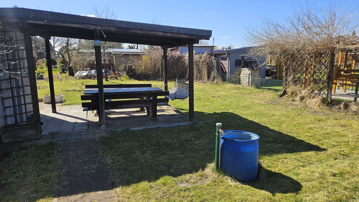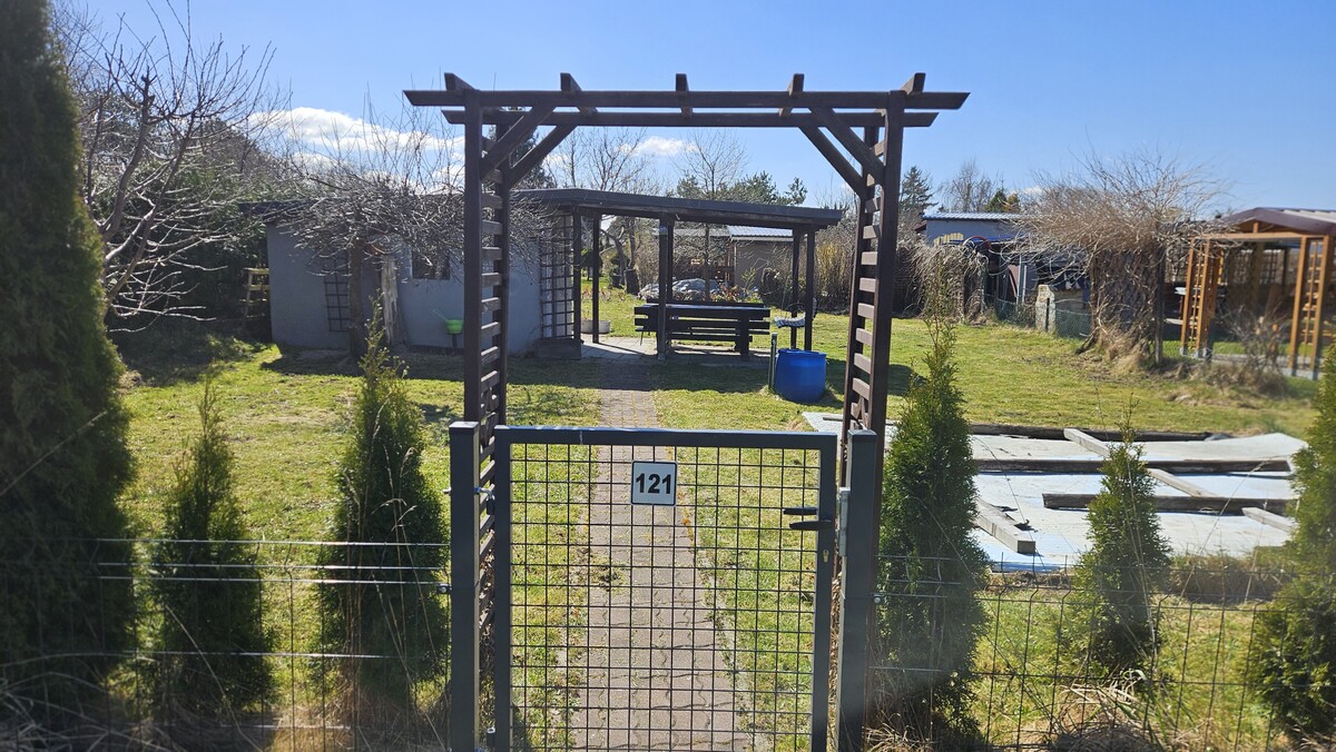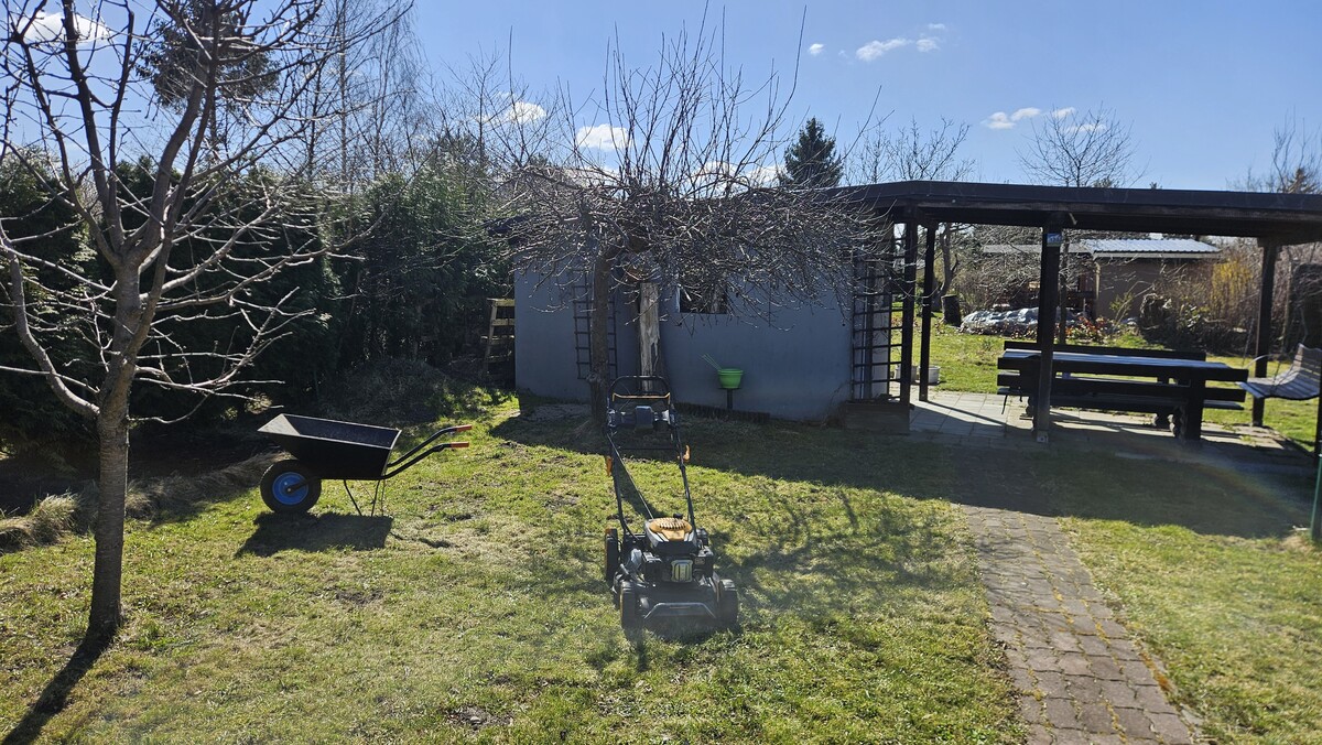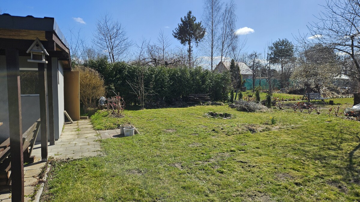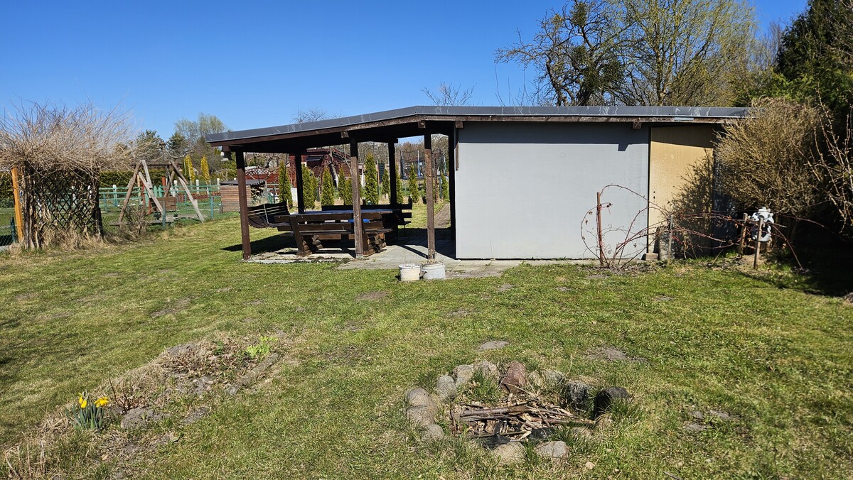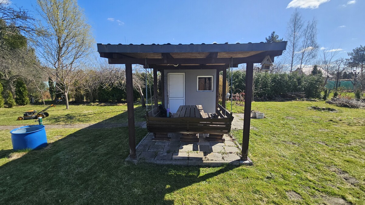 Wyposażenie: 2x kosiarka (jedna do lekkiej naprawy), taczka, komplet mebli drewnianych- stół, ławki i bujawka, narzędzia ogrodowe, leżaki itp. Na działce też są nowe deski z tartaku, np. na domek, oraz basen 3,5m (kupiony w tamtym roku, do wyczyszczenia). Drzewa na działce: jerzyna, grusza, jabłoń, wiśnia, 2x czereśnia.
