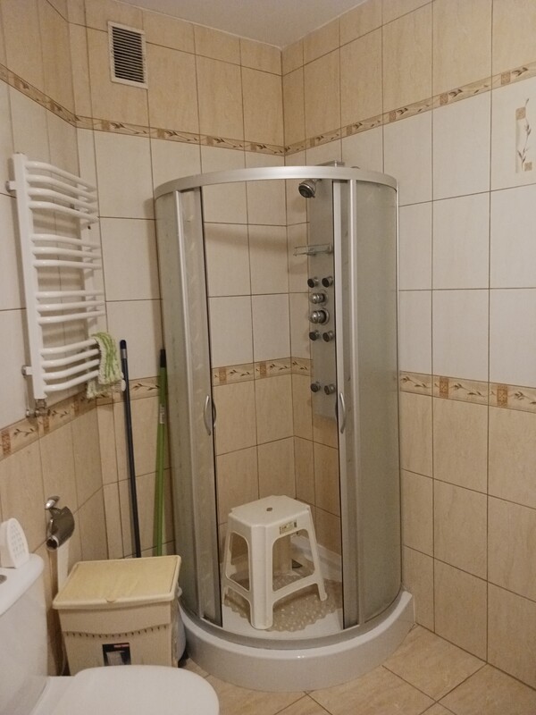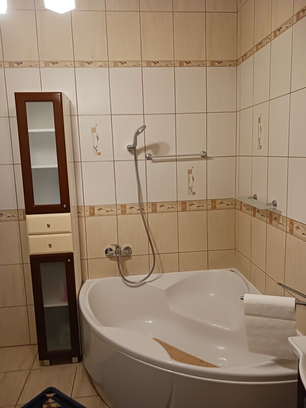 Do dyspozycji wynajmujących salon z aneksem kuchennym kompletnie wyposażonym (lodówka, płyta elektryczna, piekarnik, zmywarka, mikrofala, komplet naczyń) oraz łazienka z WC, pralką, kabiną prysznicową i wanną + dodatkowe osobne WC.