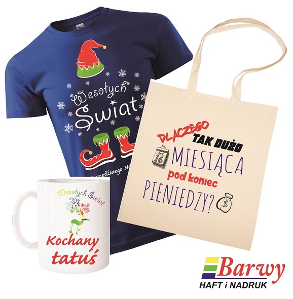 Jeśli koszulka to za mało, można nam zlecić wykonanie czapki z haftem lub nadrukiem, bluzy lub nawet kurtki. Wszystko zależy od potrzeb i możliwości finansowych pomysłodawcy. Poza prezentami z wyższej półki mamy też w ofercie drobne upominki z nadrukiem. Za jedyne 15 zł można wybrać metalowy brelok z własnym nadrukiem ( imię, fotka, nr rejestracyjny auta – pełna dowolność), torbę na zakupy z zabawnym napisem, a za 25 zł kubek z aplikacją świąteczną i na przykład imieniem obdarowywanego. Za 40 zł poduszeczkę z nadrukowaną na froncie - fotografią lub napisem. I wszystko to z gwarancją wyjątkowości!