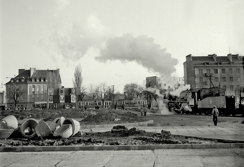 Zdjęcie zrobione z tzw. placu czerwonego (czerwonego od glinki, którą była wysypana jego powierzchnia, dzisiaj to plac Konstytucji). Pociąg za chwilę wjedzie w ulicę Parkową (dziś ul. 3 Maja), na drugim tle widać tramwaj (fot. H. Myśliński)