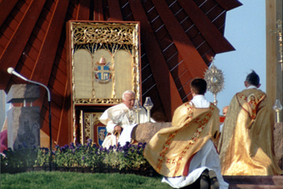 Papieska wizyta zgromadziła tłumy na lotnisku. Po niej pozostały m. in. wybudowany specjalnie na tę okazję tunel łączący Zatorze zresztą miasta na dworcu PKP i winda, którą papież wjeżdżał na ołtarz, a dziś jeżdżą urzędnicy i klienci Urzędu Miejskiego (fot. H. Myśliński).