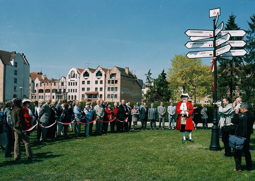 Odsłonięcie pamiątkowego drogowskazu do miast partnerskich Elbląga przy ul. Rycerskiej. Dziś ten drogowskaz znajduje się przy parkingu na pl. Słowiańskim. W tle "Nówka Starówka". (fot. H. Myśliński)