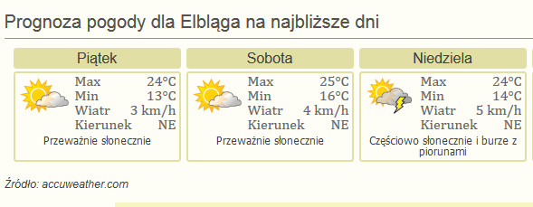 A pogoda według prognozy na najbliższe dni powinna być typowo letnia i sprzyjająca wszelkiego typu wypadom i aktywnościom w plenerze. Choć pamiętać należy, że nie jest to obietnica, ale jedynie prognoza, a z tymi bywa różnie...
