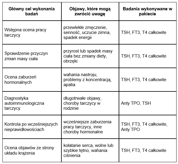 Tabela 1: Cele i zakres pakietu badań na tarczycę.