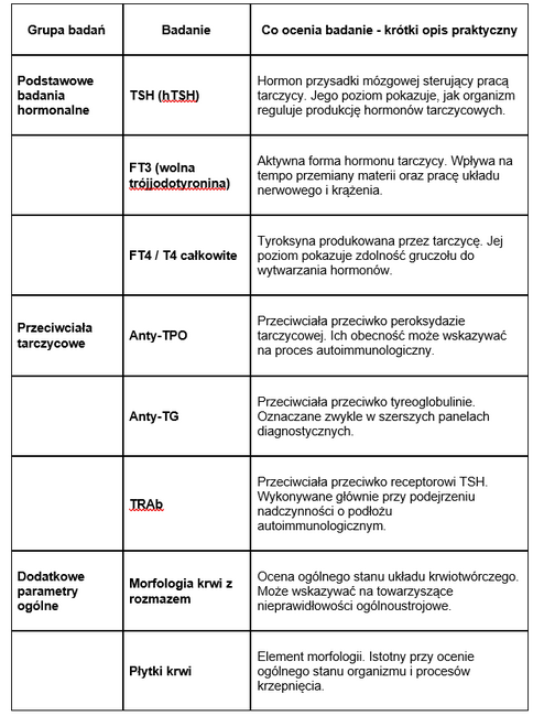Najczęściej spotkasz zestaw: TSH, FT3, FT4 oraz przeciwciała (zwykle anty-TPO, a w rozszerzeniach także anty-TG i TRAb), czasem dochodzą badania ogólne jak morfologia.