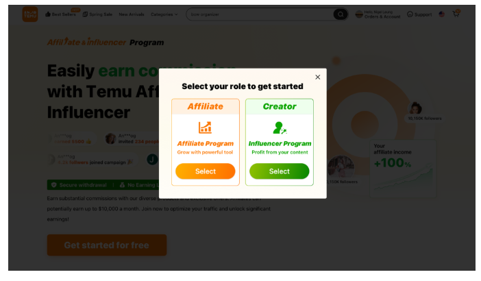 - Krok 4. Zacznij zarabiać: Po zatwierdzeniu możesz od razu uzyskać dostęp do panelu afiliacyjnego i rozpocząć promowanie TEMU.
