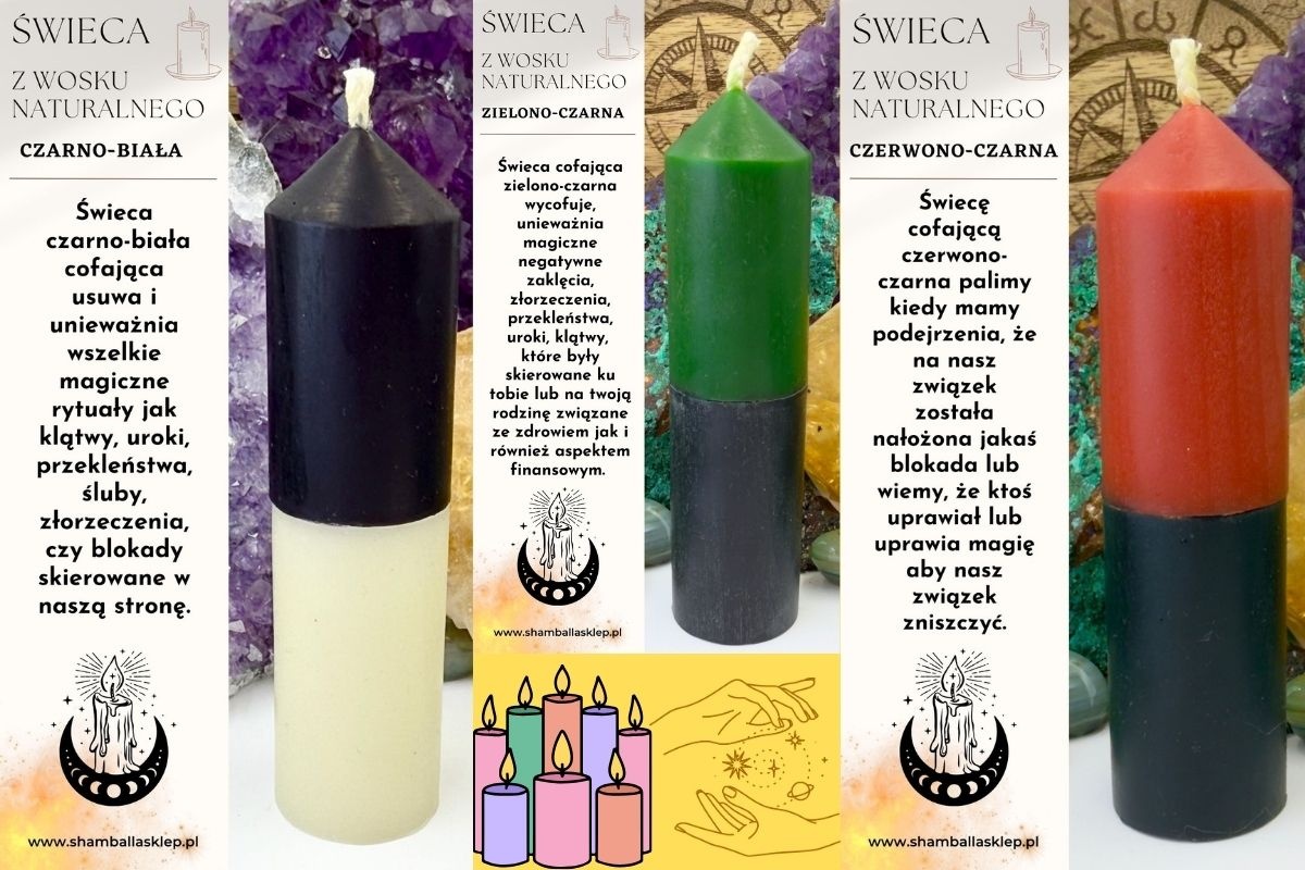 Czarno-białe świece cofające łączą w sobie energię oczyszczenia (czarny) i energię odbudowy energetycznej siły (biały).