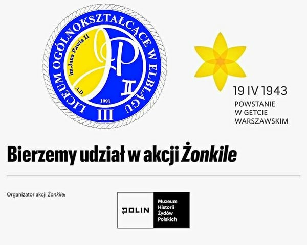 19 kwietnia Muzeum Historii Żydów Polskich POLIN organizowało akcję społeczno-edukacyjną „Żonkile”, w której po raz pierwszy udział wzięło III liceum. Uczniowie klasy Ib przy wejściu rozdawali papierowe żonkile - symbol powstania. Dzięki materiałom IPN, na korytarzach szkolnych została przygotowana wystawa, upamiętniająca walczących w powstaniu Żydów oraz Polaków ratujących Żydów podczas II wojny światowej - Irenę Sendlerową czy rodzinę Ulmów. Miłośnicy historii z kl. 3a - Amelia Mańkowska, Gabrysia Szymborska i Łukasz Chomicz przygotowali bogaty materiał lekcji otwartych, obejmujący historię zrywu w getcie warszawskim, Żydów w literaturze, teatrze i malarstwie. Z lekcji skorzystały również klasy: 3e, 3f, 2c, 2b, 1b, 3 d i 1a.