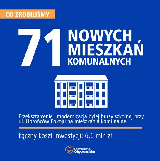 Kolejne władze postanowiły jednak, że miastu bardziej potrzebne są mieszkania komunalne i budynek byłej bursy przy ul. Obrońców Pokoju został przeznaczony do adaptacji właśnie na ten cel. W projekcie znalazło się 71 mieszkań. Prace modernizacyjno-budowlane ruszyły w 2012 r. Zakończyły się kilka tygodni temu. 29 listopada został podpisany protokół odbioru robót.